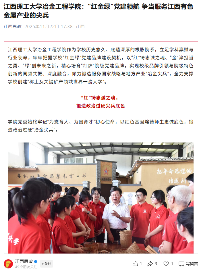 党委始终牢记“为党育人、为国育才”初心使命,以红色基因熔铸师生忠诚底色,锻造政治过硬“冶金尖兵”。