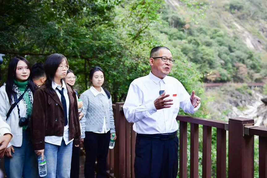 副院长陈飞带领师生穿行在燕子岩景区,在丹霞奇峰、飞瀑林海构成的自然画卷中上了一堂“行走的思政课”,同学们在游览中解开了地球演化的密码,读懂了地球的“年轮”。景区讲解员同步普及生态保护理念,师生们在灵泽潭、同心桥等地定格“红色文化+绿色生态”的交融瞬间,让革命精神与生态文明理念同频共振。