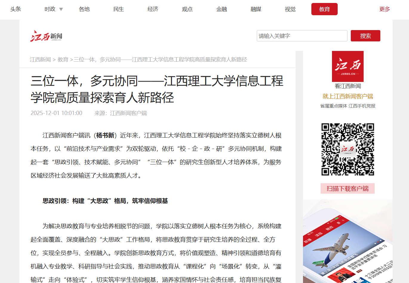 、企业、政府、科研机构等多方参与的“共生型”育人生态,打破高校与社会之间的壁垒,形成权责清晰、优势互补、资源共享的可持续合作机制。在校企协同方面,共建实体化平台,推行“双导师制”,实现人才培养与产业需求精准对接;在校政协同方面,主动对接地方发展战略,引导学生在服务地方中锻炼能力;在校研协同方面,加强与顶尖科研院所合作,拓宽学生学术视野,提升科研起点。通过这一多元协同体系,让研究生培养从“校园闭环”走向“社会融合”,全面增强了学生的综合素质与社会适应力。近五年来,学生在“互联网+”“挑战杯”等高水平竞赛中屡获佳绩,获奖级别与数量位列全省前茅。毕业生以其扎实的专业功底、出色的实践能力和创新意识,深受华为、阿里巴巴、腾讯等知名企业及江西本土重点单位的欢迎,迅速成长为推动行业与区域发展的重要力量。