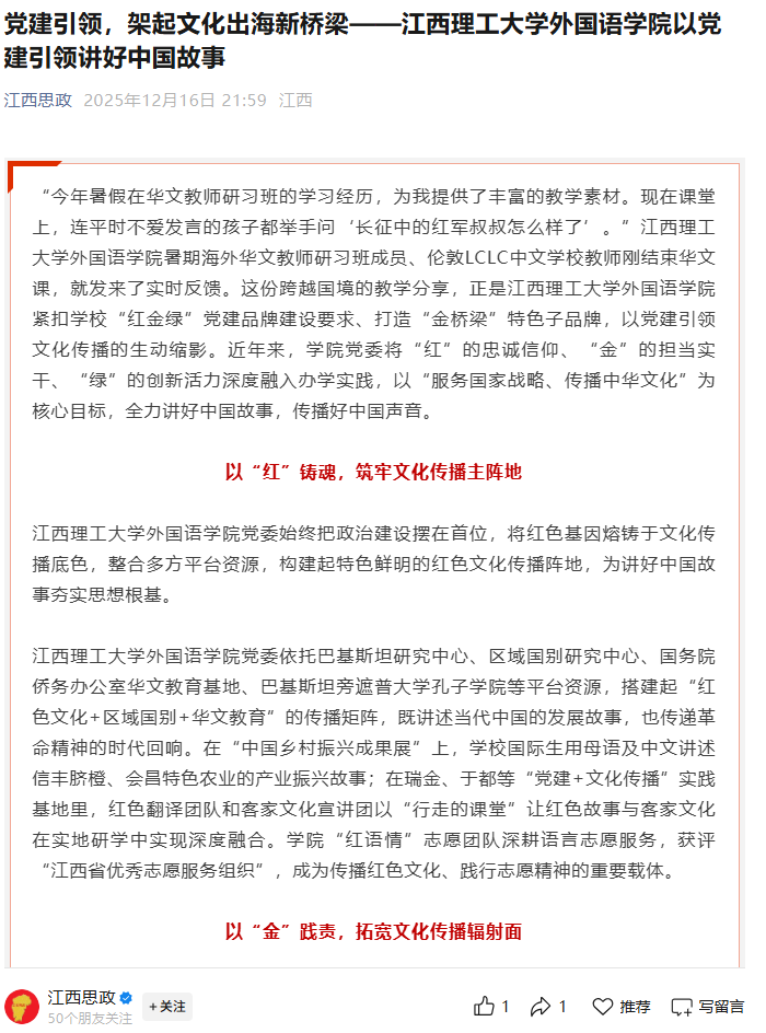 党委通过“教师远航”“学生外派”“项目合作”等方式,推动中国故事“落地海外”。近年累计选派党员教师赴泰国、印尼、巴基斯坦开展华文师资培训及汉语国际化推广,培训海外师资超300人次,其中教工第四党支部书记江宇豪在2024年印尼“名师巡讲”活动中收获广泛好评;2025年承办“牵手赣鄱・情系华文”海外华文教师研习班,以优质课程服务17国53名华文教师,获江西省委统战部专函致谢。大发娱乐