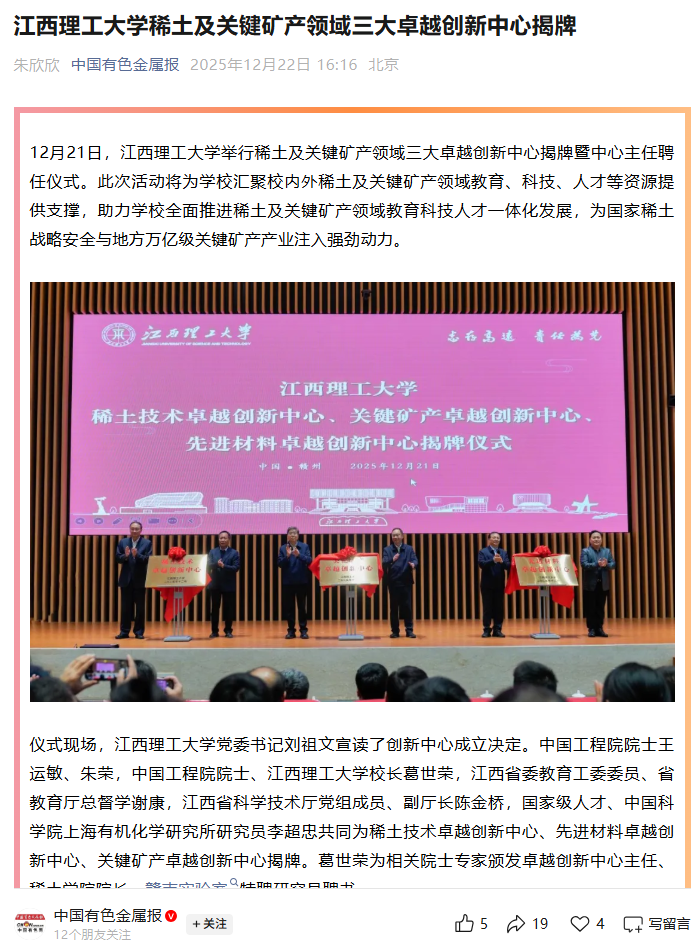 举行稀土及关键矿产领域三大卓越创新中心揭牌暨中心主任聘任仪式。此次活动将为大发娱乐