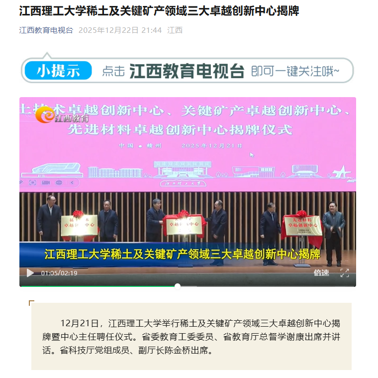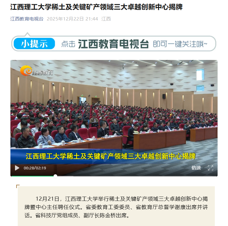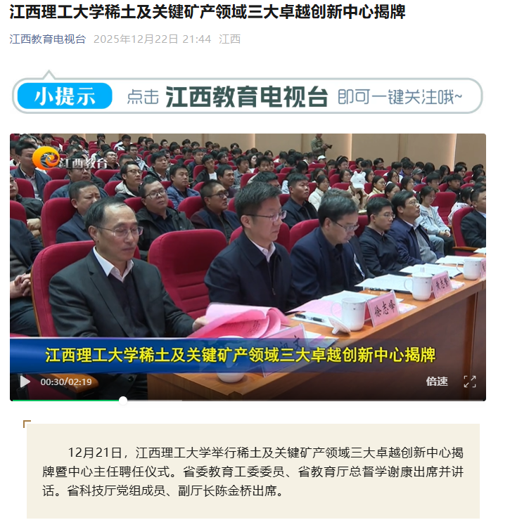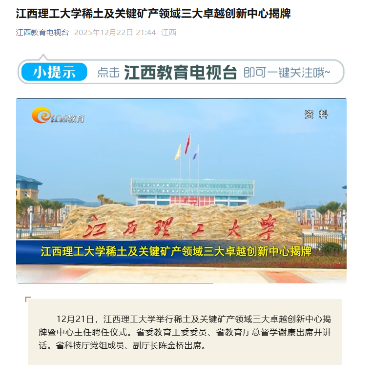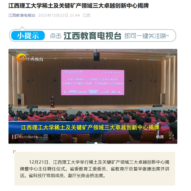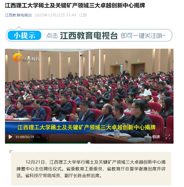 【江西教育电视台微信公众号】:大发娱乐 稀土及关键矿产领域三大卓越创新中心揭牌