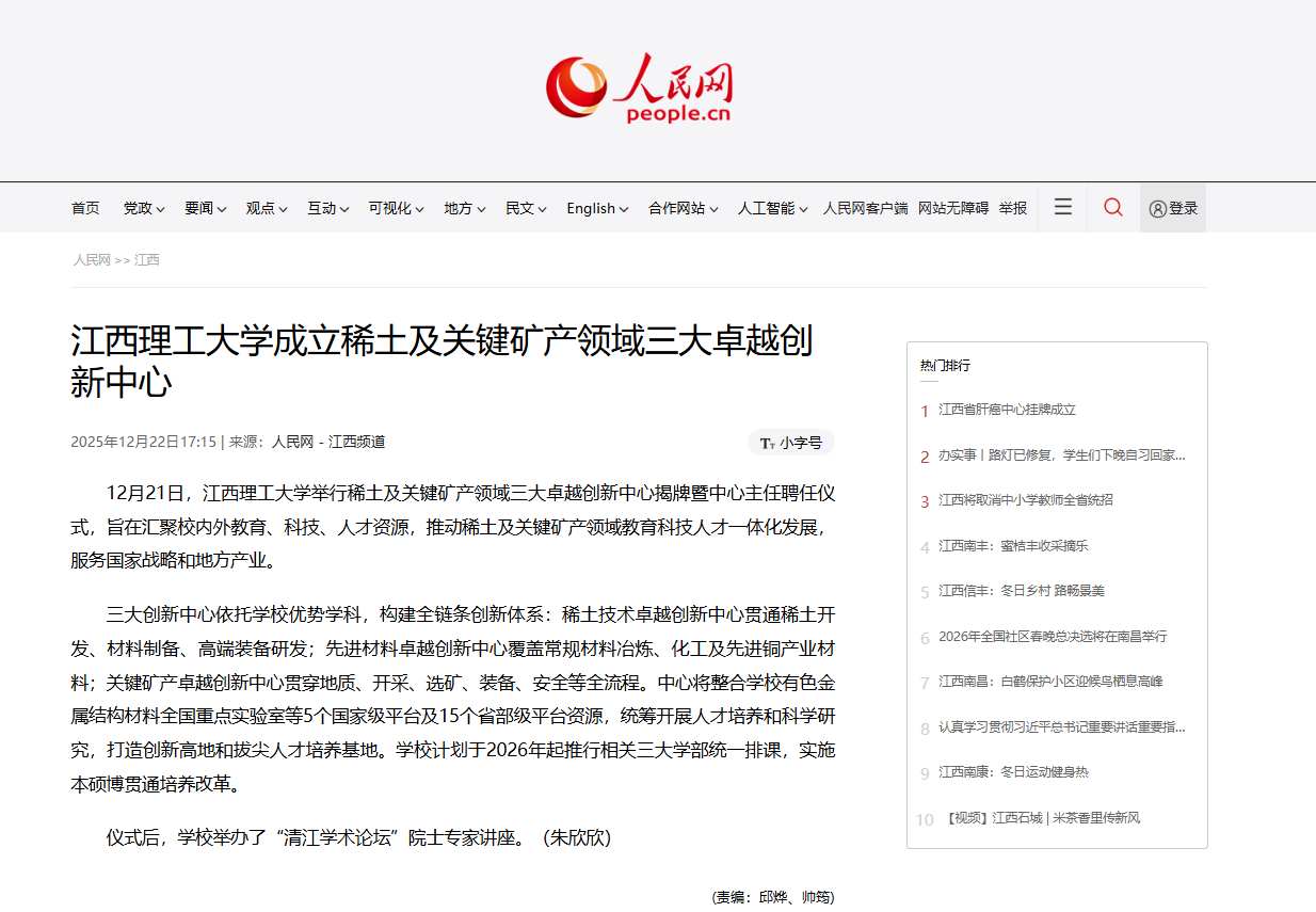 《人民网》:大发娱乐 成立稀土及关键矿产领域三大卓越创新中心