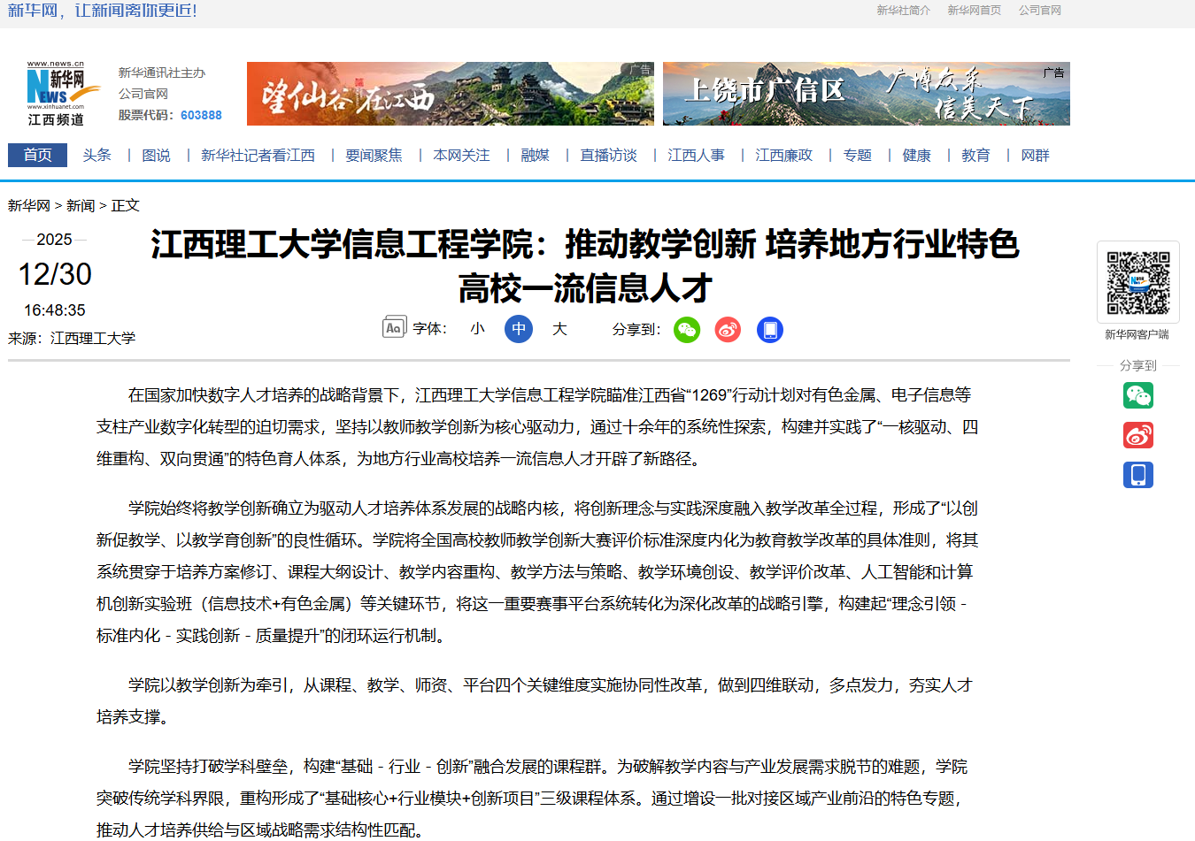 瞄准江西省“1269”行动计划对有色金属、电子信息等支柱产业数字化转型的迫切需求,坚持以教师教学创新为核心驱动力,通过十余年的系统性探索,构建并实践了“一核驱动、四维重构、双向贯通”的特色育人体系,为地方行业高校培养一流信息人才开辟了新路径。