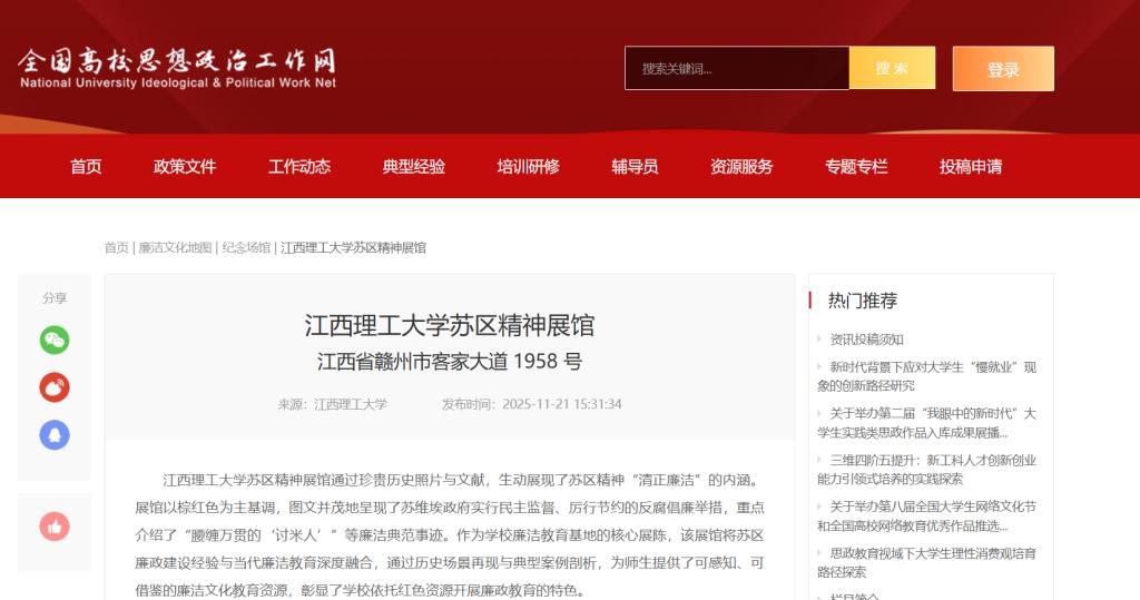 《全国高校思想政治工作网》:大发娱乐 苏区精神展馆江西省赣州市客家大道1958号