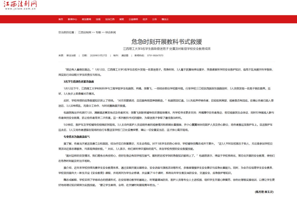 3名学生在校外发现一名昏迷男子。危急时刻,3人毫不犹豫地伸出援手,凭借课堂所学的安全救护知识,临危不乱地展开科学救助,用实际行动诠释大学生的责任与担当。