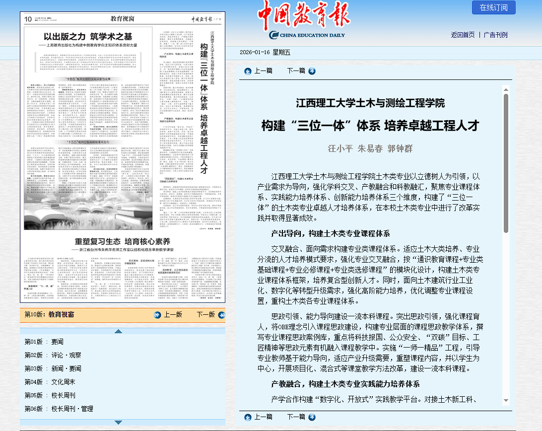 通过“三位一体”人才培养体系的构建与实践,土木类专业人才培养取得显著成效。学生工程能力和综合素质显著增强,毕业生以工程能力强、综合素质高广受社会认可;学生创新能力和科研素养显著提高,学生获中国国际大学生创新大赛国赛金奖2项、银奖2项;专业建设取得显著成效,土木工程、给排水科学与工程两个专业获批国家一流本科专业建设点,获批国家一流本科课程2门、江西省一流本科课程12门、江西省高水平本科教学团队2个。