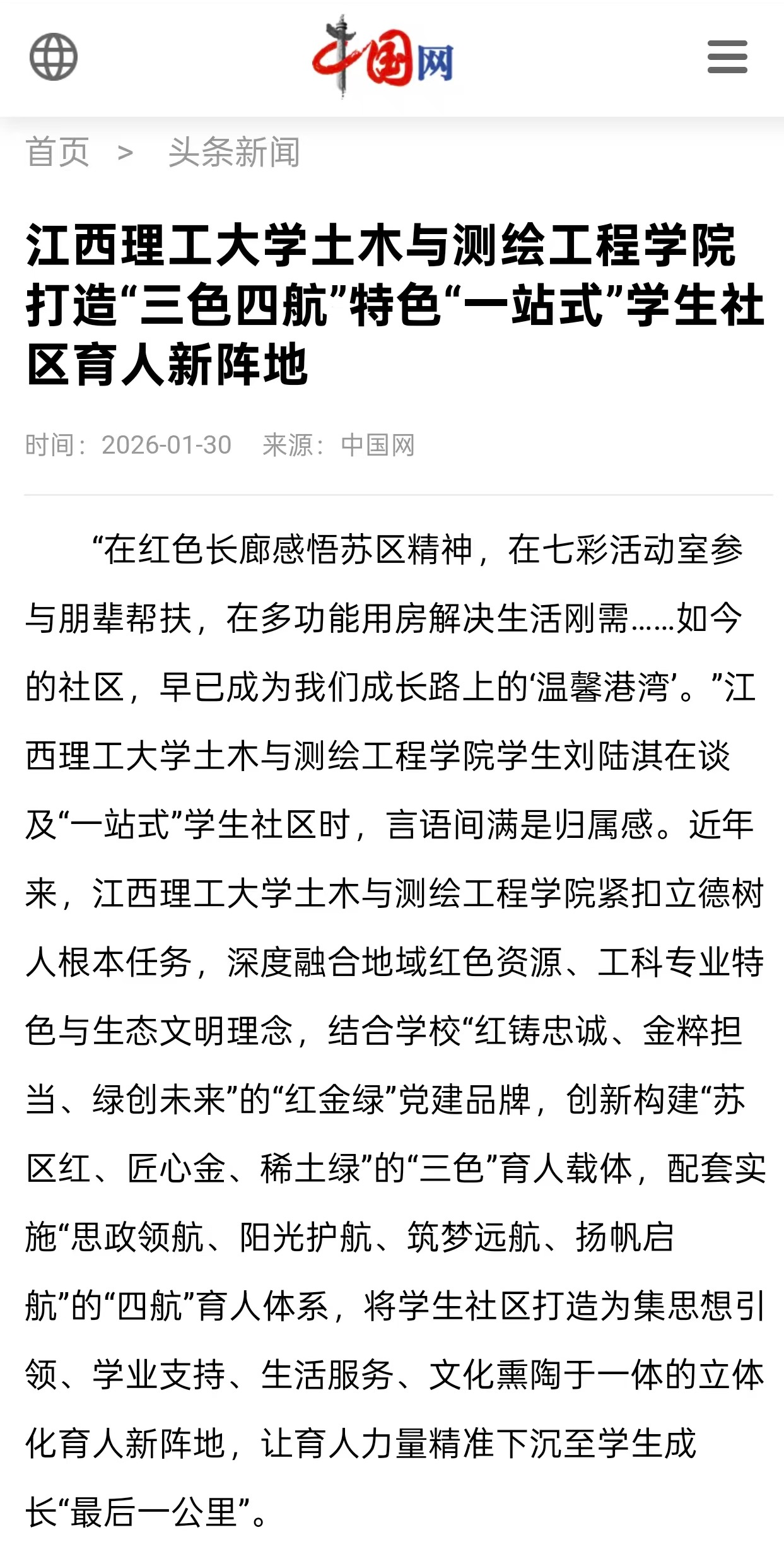 “红铸忠诚、金粹担当、绿创未来”的“红金绿”党建品牌,创新构建“苏区红、匠心金、稀土绿”的“三色”育人载体,配套实施“思政领航、阳光护航、筑梦远航、扬帆启航”的“四航”育人体系,将学生社区打造为集思想引领、学业支持、生活服务、文化熏陶于一体的立体化育人新阵地,让育人力量精准下沉至学生成长“最后一公里”。
