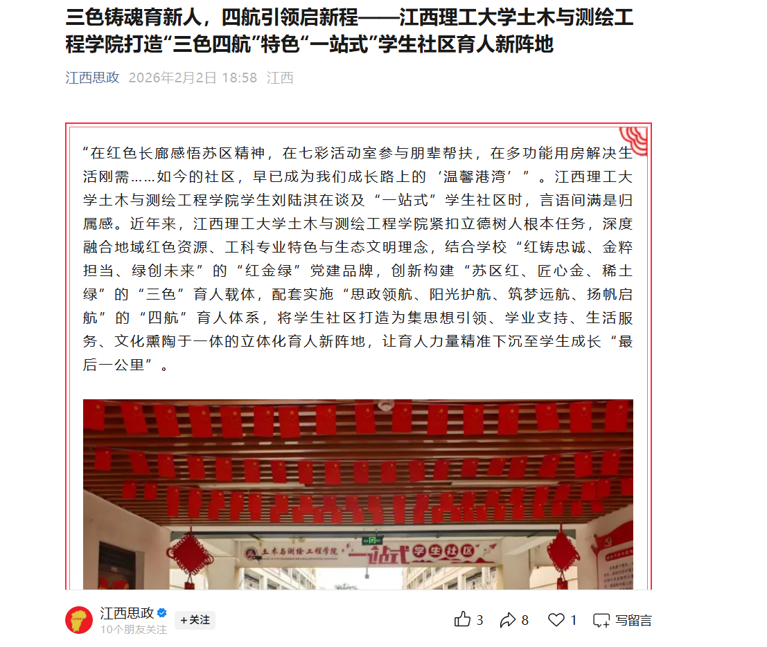 “红铸忠诚、金粹担当、绿创未来”的“红金绿”党建品牌,创新构建“苏区红、匠心金、稀土绿”的“三色”育人载体,配套实施“思政领航、阳光护航、筑梦远航、扬帆启航”的“四航”育人体系,将学生社区打造为集思想引领、学业支持、生活服务、文化熏陶于一体的立体化育人新阵地,让育人力量精准下沉至学生成长“最后一公里”。