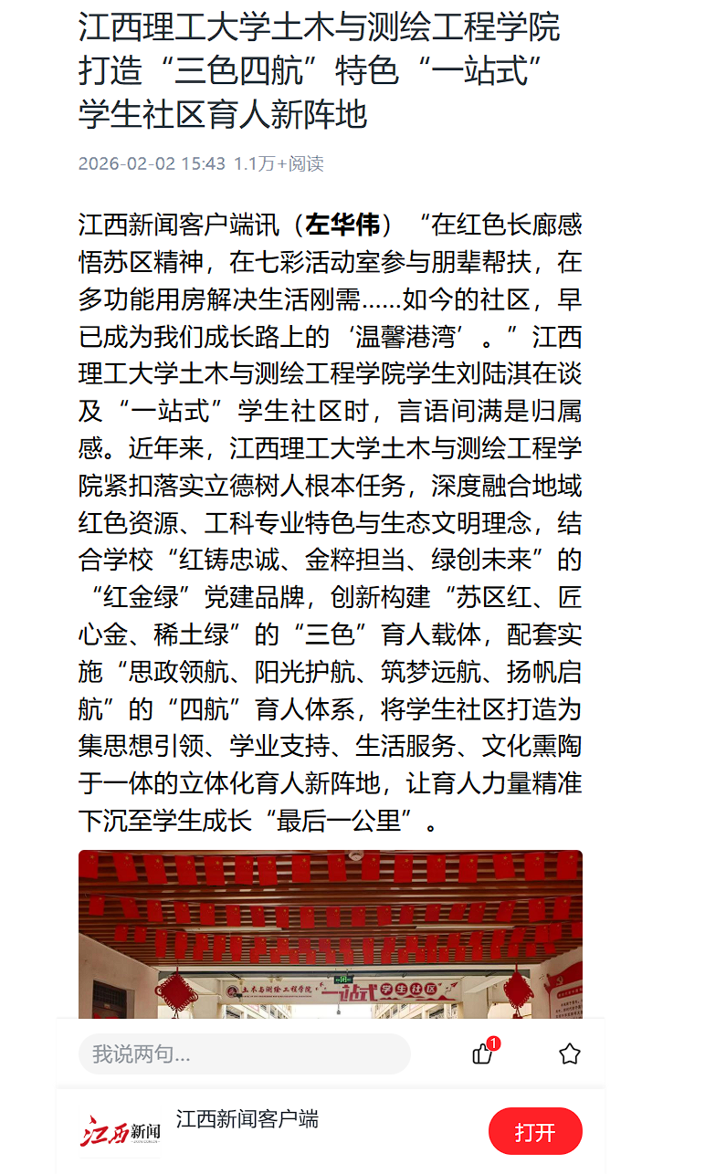 “红铸忠诚、金粹担当、绿创未来”的“红金绿”党建品牌,创新构建“苏区红、匠心金、稀土绿”的“三色”育人载体,配套实施“思政领航、阳光护航、筑梦远航、扬帆启航”的“四航”育人体系,将学生社区打造为集思想引领、学业支持、生活服务、文化熏陶于一体的立体化育人新阵地,让育人力量精准下沉至学生成长“最后一公里”。