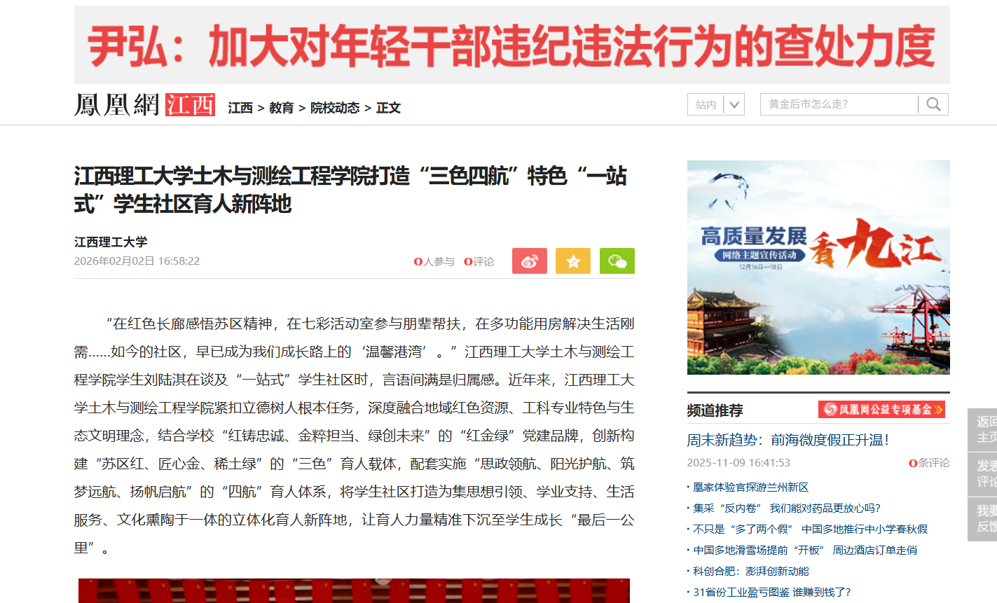 “红铸忠诚、金粹担当、绿创未来”的“红金绿”党建品牌,创新构建“苏区红、匠心金、稀土绿”的“三色”育人载体,配套实施“思政领航、阳光护航、筑梦远航、扬帆启航”的“四航”育人体系,将学生社区打造为集思想引领、学业支持、生活服务、文化熏陶于一体的立体化育人新阵地,让育人力量精准下沉至学生成长“最后一公里”。