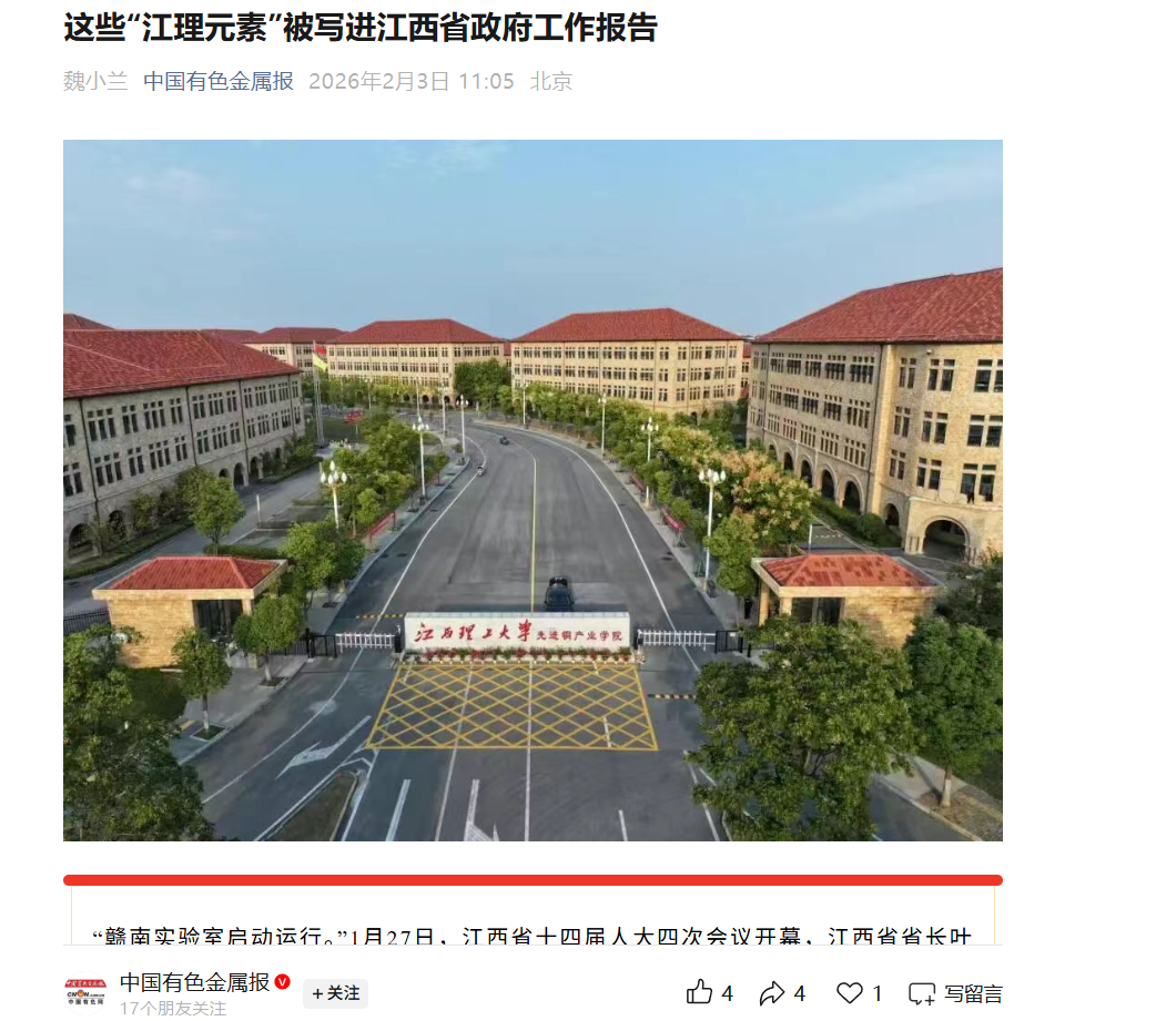 在回顾2025年工作时,该报告1次提到“江理元素”,明确点出“赣南实验室启动运行”。此前,赣南实验室启动会在大发娱乐