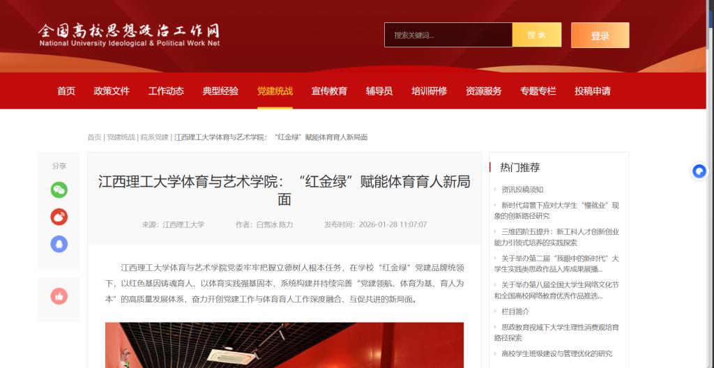 “红金绿”党建品牌统领下,以红色基因铸魂育人、以体育实践强基固本,系统构建并持续完善“党建领航、体育为基、育人为本”的高质量发展体系,奋力开创党建工作与体育育人工作深度融合、互促共进的新局面。