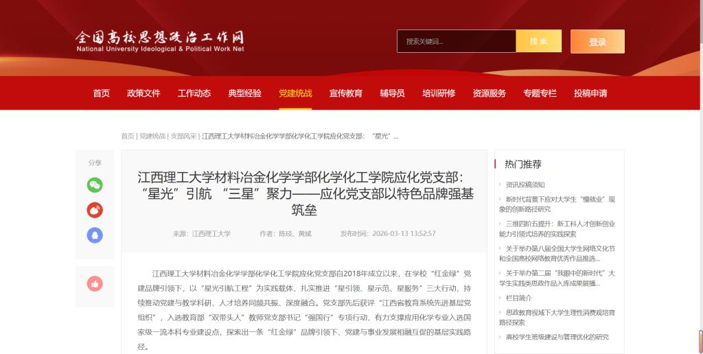 “红金绿”党建品牌引领下,以“星光引航工程”为实践载体,扎实推进“星引领、星示范、星服务”三大行动,持续推动党建与教学科研、人才培养同频共振、深度融合。党支部先后获评“江西省教育系统先进基层党组织”,入选教育部“双带头人”教师党支部书记“强国行”专项行动,有力支撑应用化学专业入选国家级一流本科专业建设点,探索出一条“红金绿”品牌引领下、党建与事业发展相融互促的基层实践路径。