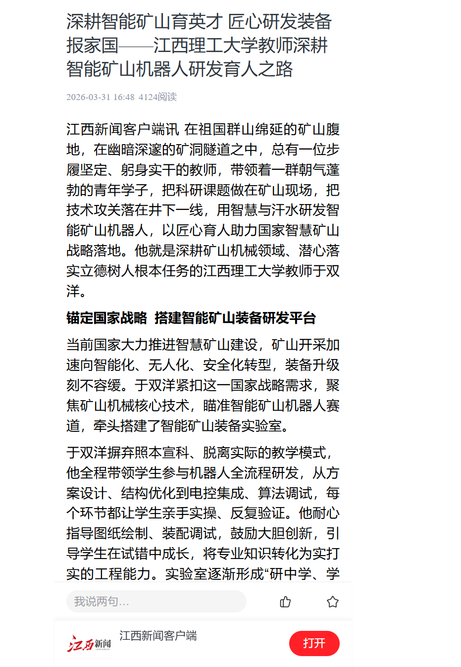 江西新闻客户端讯 在祖国群山绵延的矿山腹地,在幽暗深邃的矿洞隧道之中,总有一位步履坚定、躬身实干的教师,带领着一群朝气蓬勃的青年学子,把科研课题做在矿山现场,把技术攻关落在井下一线,用智慧与汗水研发智能矿山机器人,以匠心育人助力国家智慧矿山战略落地。他就是深耕矿山机械领域、潜心落实立德树人根本任务的大发娱乐