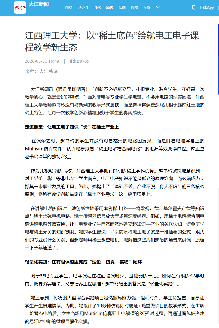 拥有鲜明的稀土学科优势。赵书玲敏锐地意识到,对于采矿、稀土等非电专业学生而言,电工电子知识不能是孤立的原理堆砌,而必须成为支撑其未来职业发展的工具。为此,她提出了“基础不丢、产业不脱、育人不虚”的三条核心原则,将所有教学创新锚定在“稀土产业需求”这一应用场景上。