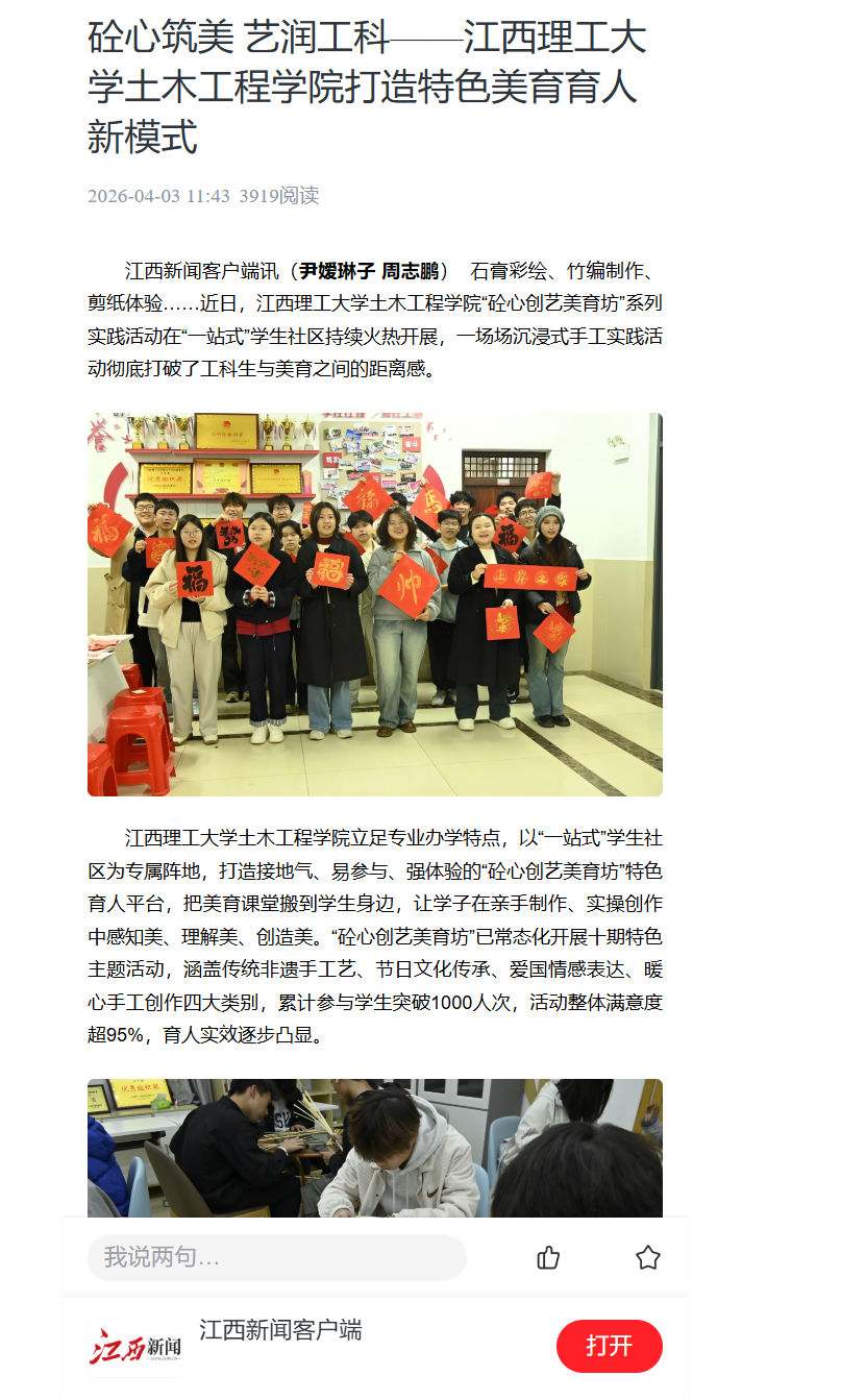 立足专业办学特点,以“一站式”学生社区为专属阵地,打造接地气、易参与、强体验的“砼心创艺美育坊”特色育人平台,把美育课堂搬到学生身边,让学子在亲手制作、实操创作中感知美、理解美、创造美。“砼心创艺美育坊”已常态化开展十期特色主题活动,涵盖传统非遗手工艺、节日文化传承、爱国情感表达、暖心手工创作四大类别,累计参与学生突破1000人次,活动整体满意度超95%,育人实效逐步凸显。