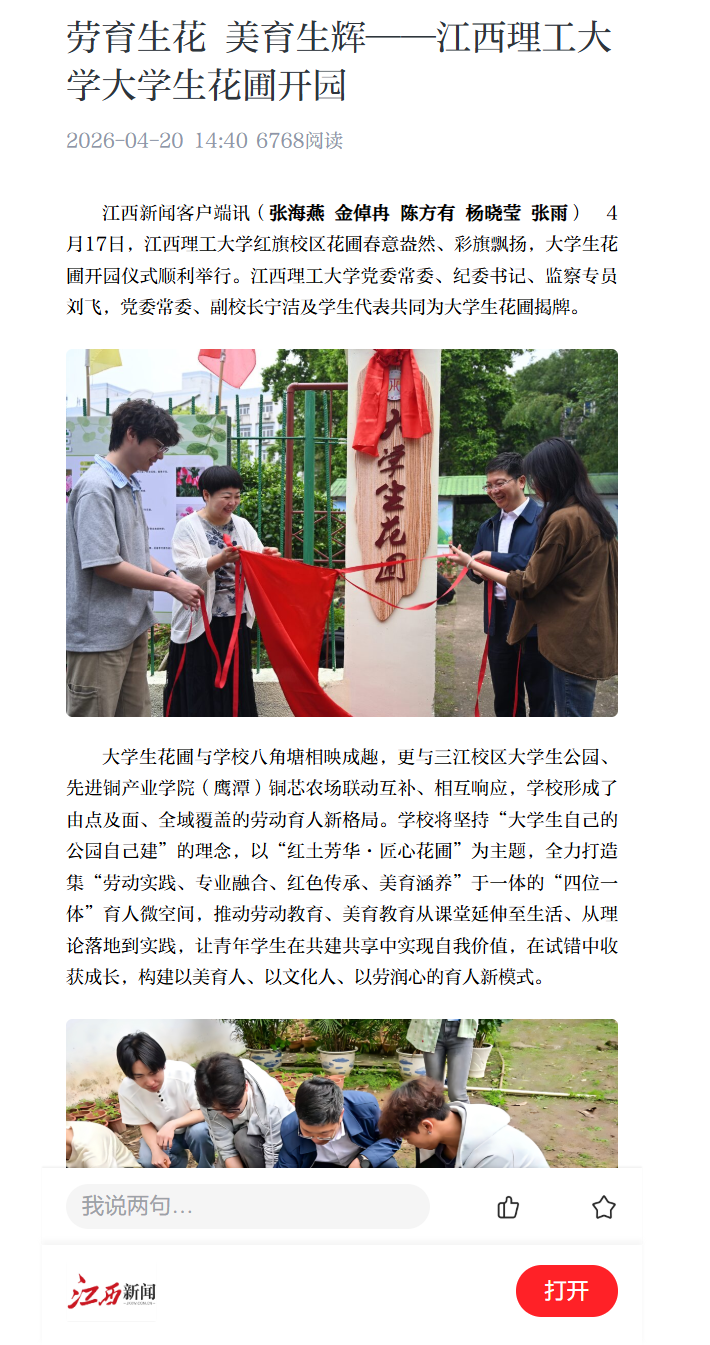 将坚持“大学生自己的公园自己建”的理念,以“红土芳华·匠心花圃”为主题,全力打造集“劳动实践、专业融合、红色传承、美育涵养”于一体的“四位一体”育人微空间,推动劳动教育、美育教育从课堂延伸至生活、从理论落地到实践,让青年学生在共建共享中实现自我价值,在试错中收获成长,构建以美育人、以文化人、以劳润心的育人新模式。