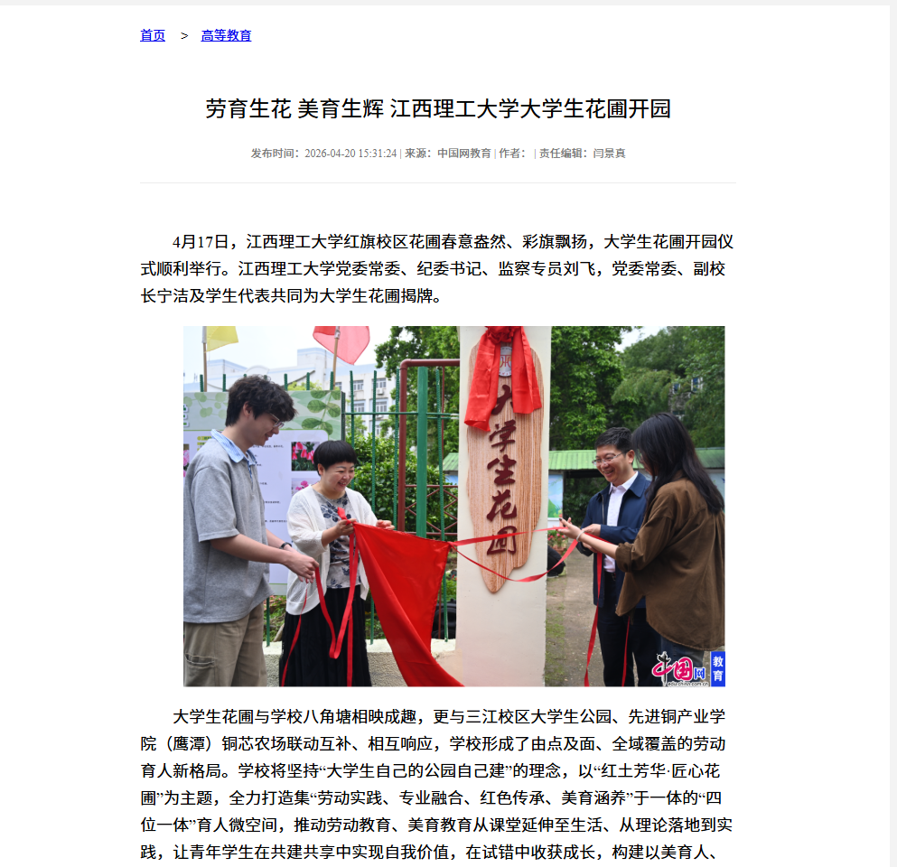 将坚持“大学生自己的公园自己建”的理念,以“红土芳华·匠心花圃”为主题,全力打造集“劳动实践、专业融合、红色传承、美育涵养”于一体的“四位一体”育人微空间,推动劳动教育、美育教育从课堂延伸至生活、从理论落地到实践,让青年学生在共建共享中实现自我价值,在试错中收获成长,构建以美育人、以文化人、以劳润心的育人新模式。