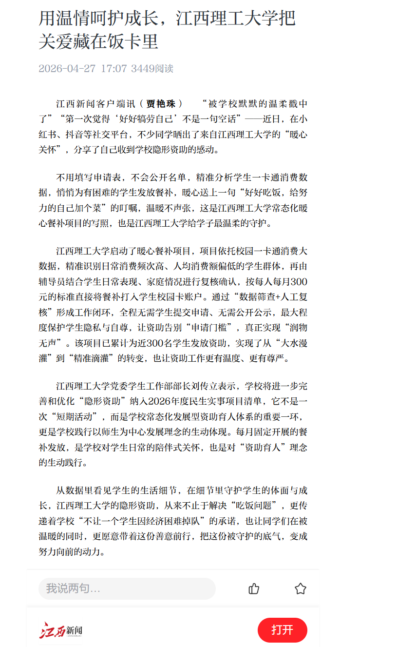 不用填写申请表,不会公开名单,精准分析学生一卡通消费数据,悄悄为有困难的学生发放餐补,暖心送上一句“好好吃饭,给努力的自己加个菜”的叮嘱,温暖不声张,这是大发娱乐