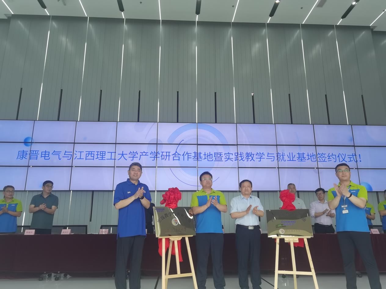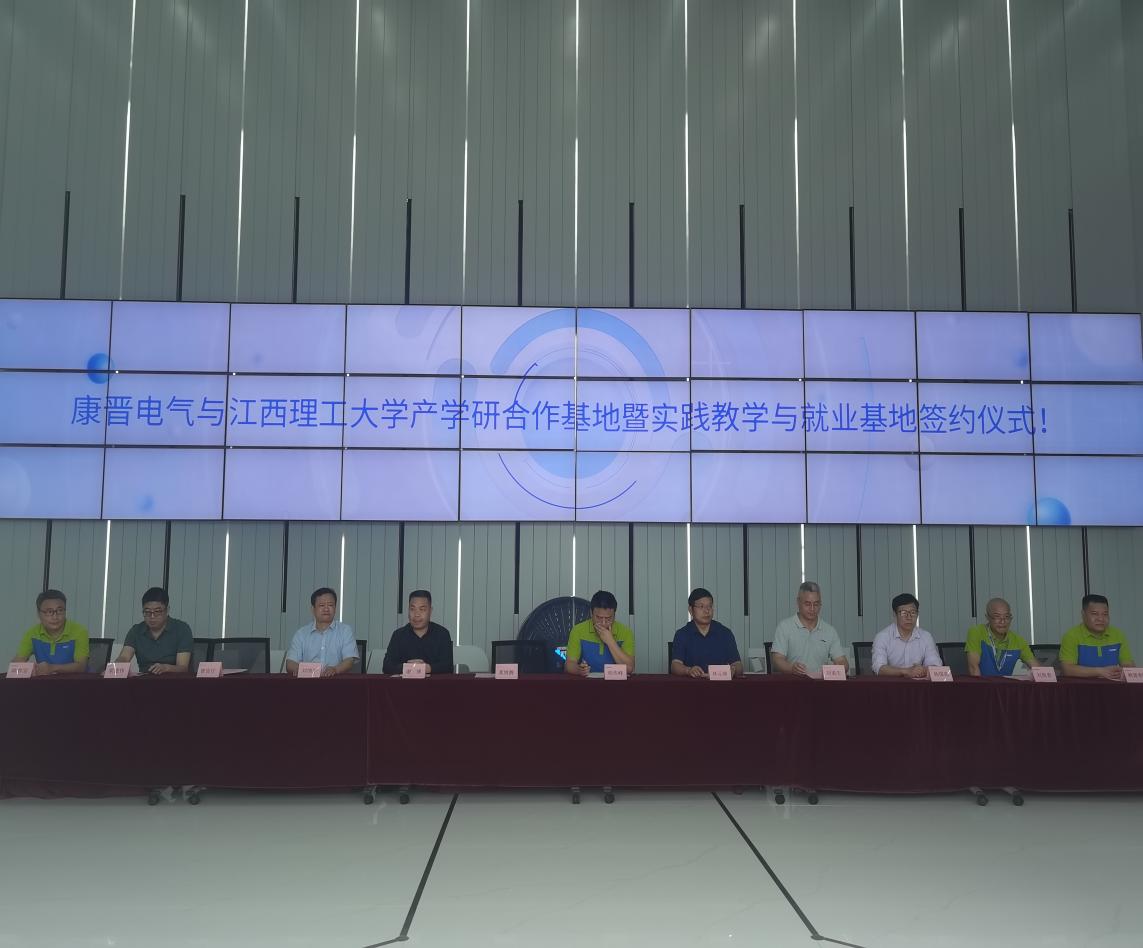 与康晋电气产学研合作基地签约仪式在赣州市康晋电气设备有限公司举行。校党委常委、副校长龚姚腾,赣州高新开发区主任谢博,康晋电气集团副总经理胡伟峰,赣州市康晋电气设备有限公司领导与员工代表,电气工程与自动化大发娱乐
