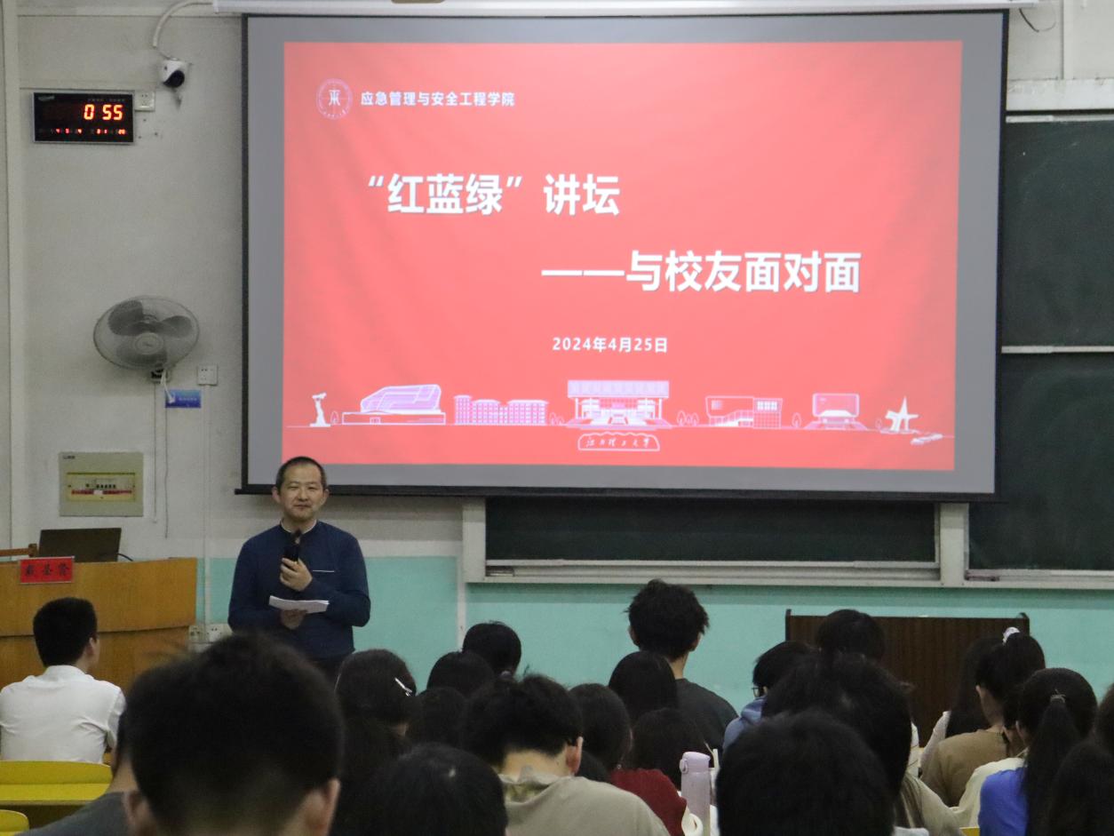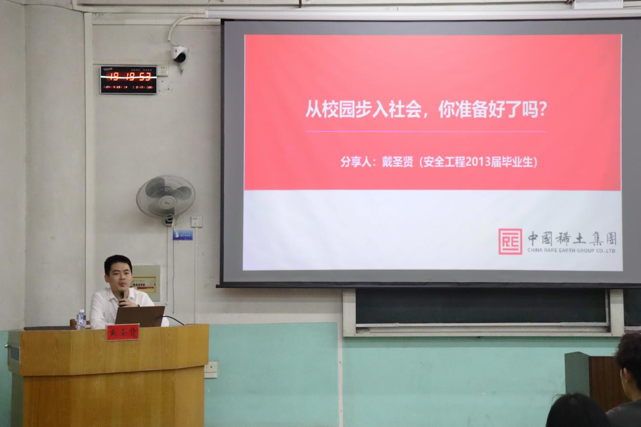 在红旗校区主教学楼D02教室举办“红蓝绿”讲坛——与校友面对面,邀请中国稀土集团南方稀土国际贸易有限公司副总经理、安全工程专业2013届毕业生戴圣贤作题为《从校园步入社会,你准备好了吗?》的讲座。讲座由大发娱乐