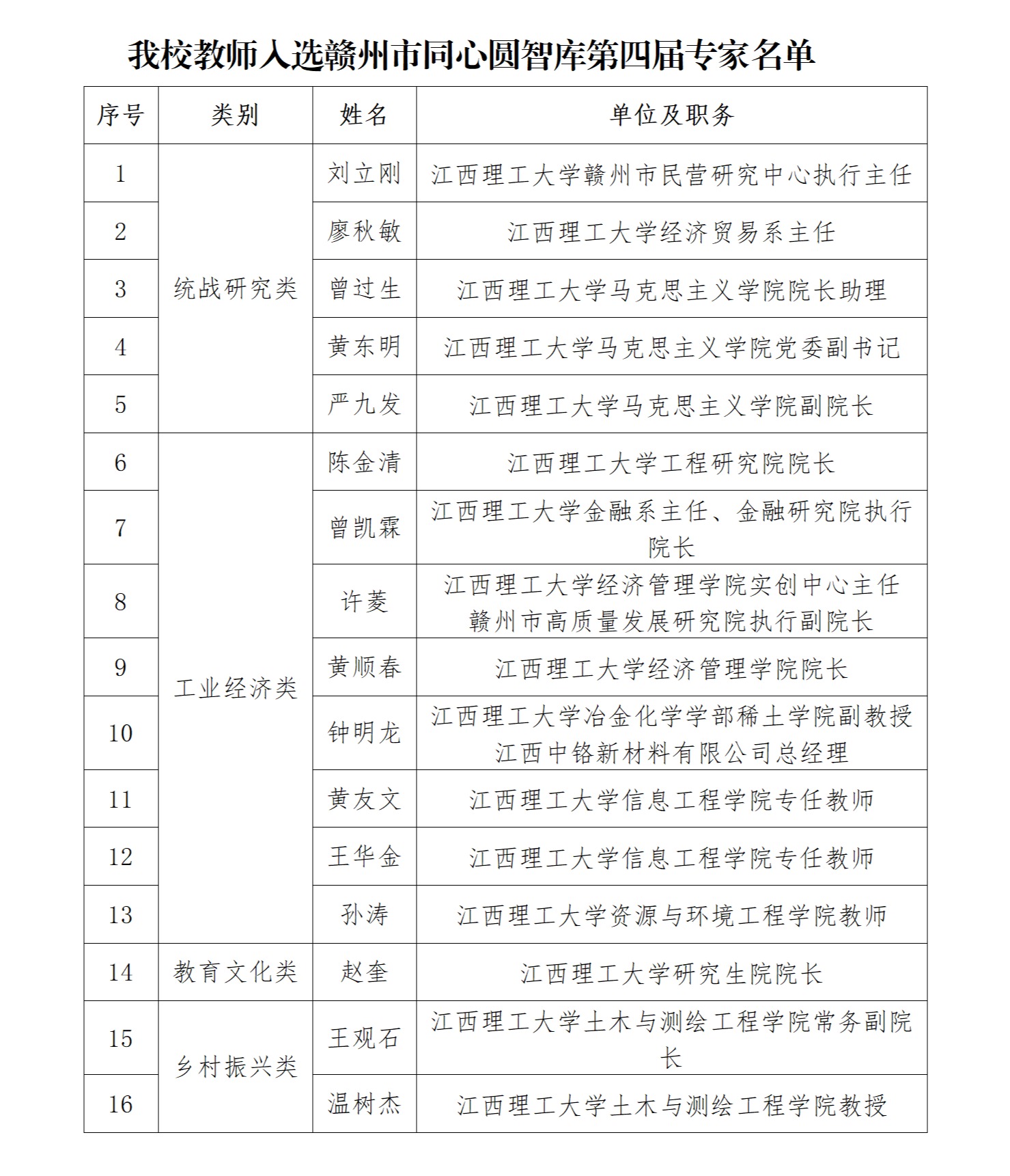 本网讯 近日,赣州市委统战部下发了《关于公布刘立刚等100位同志为赣州市同心圆智库第四届专家的通知》,大发娱乐 刘立刚、廖秋敏、曾过生等16名教师入选赣州市同心圆智库第四届专家,其中党外代表人士10名。