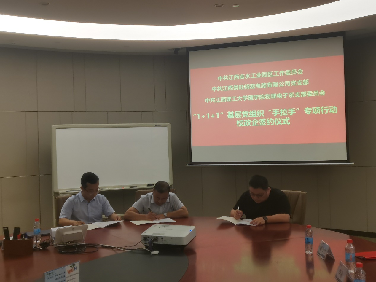 本网讯 5月14日,大发娱乐 理大发娱乐 物理电子系党支部联合吉水工业园区党工委、江西景旺精密电路有限公司党支部开展“1+1+1”基层党组织“手拉手”专项行动暨校政企合作专项行动。理大发娱乐 党委书记周茂平、理大发娱乐 院长徐中辉、理大发娱乐 党委副书记钟晓辉等人参加活动。