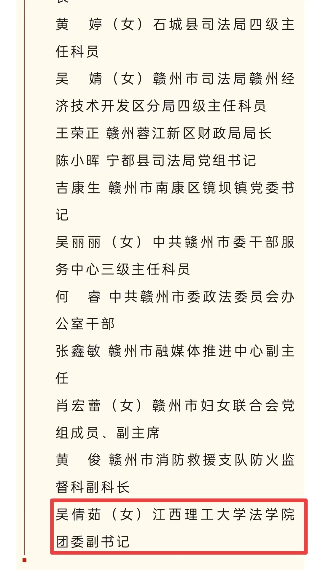 学工办副主任兼团委副书记、本科生第一党支部书记。先后荣获全省优秀共青团干部、全省青年志愿服务优秀个人、全省社会实践优秀个人等30余项;连续四年指导学生在全省“学宪法 讲宪法”活动中获奖8次;指导学生普法志愿服务队先后获评全国示范性团队、全国优秀服务队、全省优秀实践团队、全省高校红色走读先进团队、全省青年志愿服务优秀组织奖等10余项;打造的普法志愿服务项目先后荣获第六届中国青年志愿服务项目大赛铜奖、第十一届江西省青年志愿服务优秀项目、江西省文明实践社会化志愿服务项目大赛一类项目等10余项;指导撰写了《中央法律文献汇编》《苏区法制人物集》等书籍和相关调研报告,获得全省高校“红色走读”实地走读成果一等奖4项。
