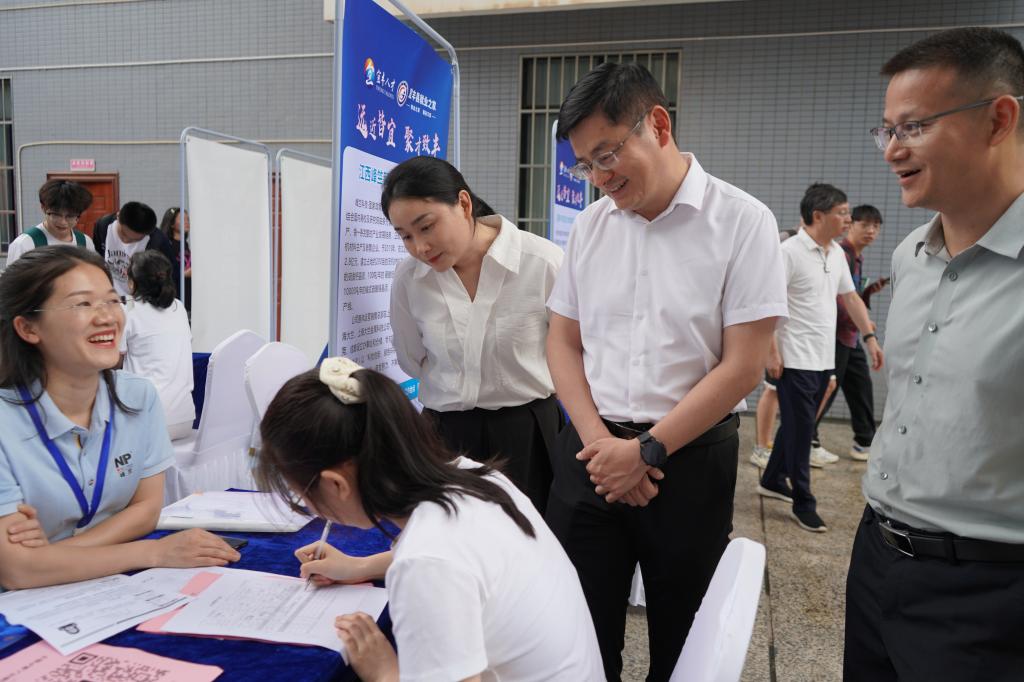 招聘现场,何征一行询问企业人才需求、薪资待遇情况,并与大发娱乐