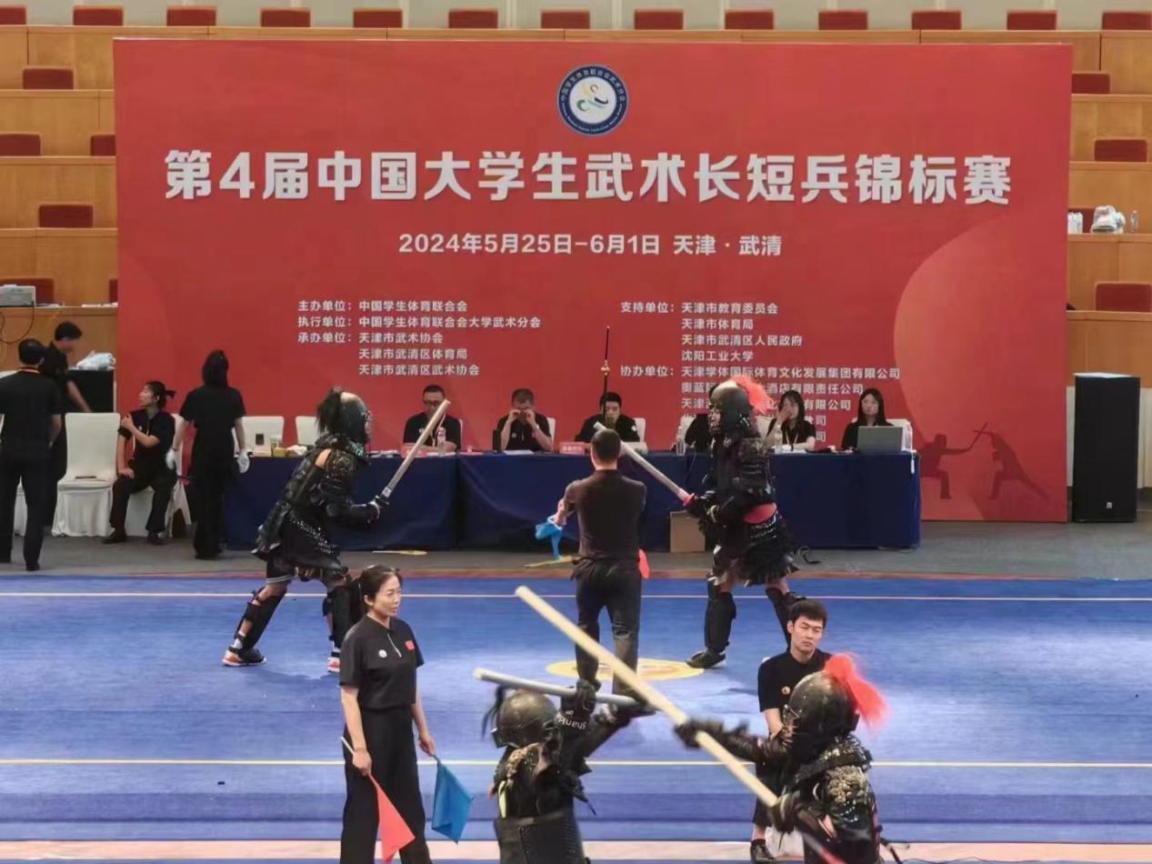 本网讯 5月27日,第四届中国大学生武术长短兵锦标赛在天津市武清区拉开帷幕。大发娱乐 代表队在比赛中勇创佳绩,取得甲组3枚银牌、2枚铜牌、2个前五,丙组1枚铜牌,甲B组团体总分全国第四名的优异成绩,并获得体育道德风尚奖;杨帆同学获得“体育道德风尚运动员”称号。