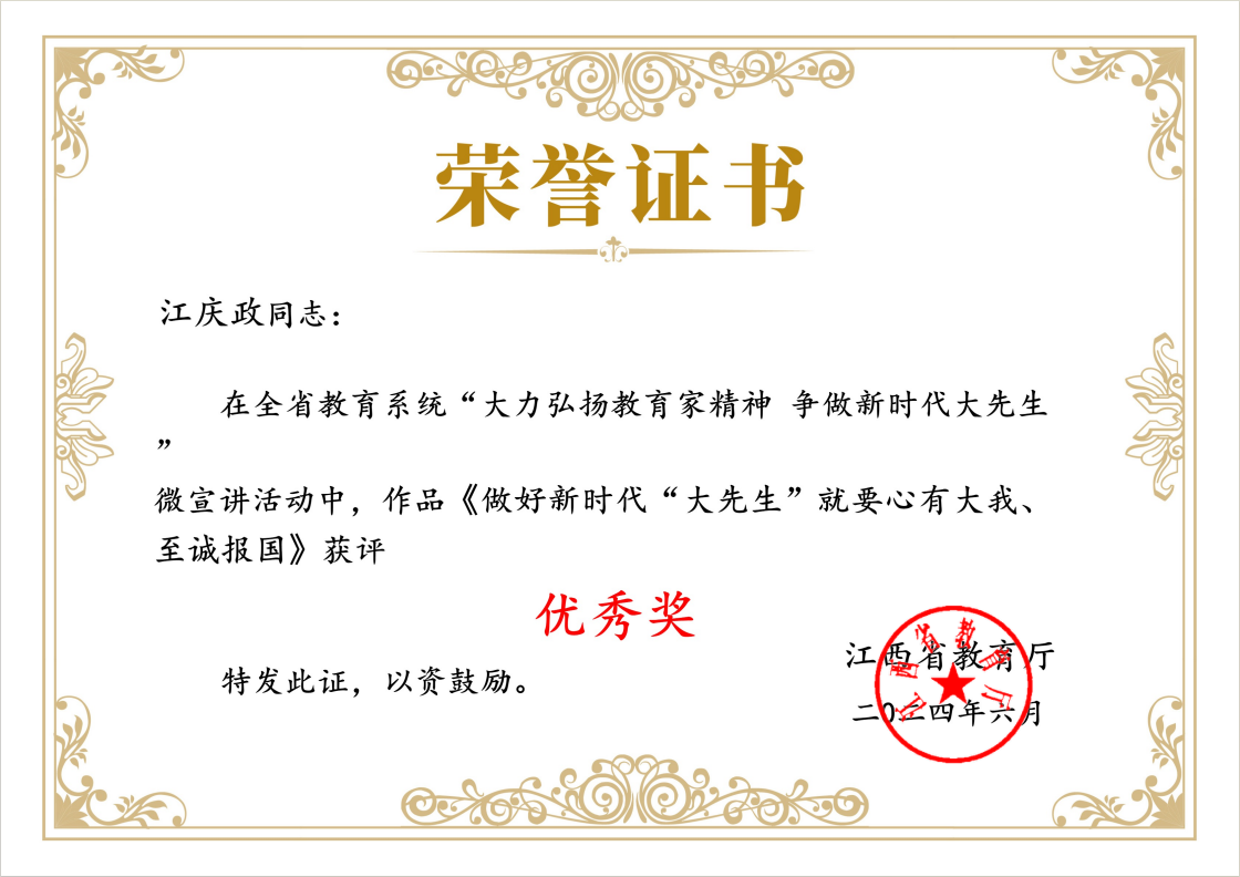 教师江庆政的作品《做好时代“大先生”就要心有大我,至诚报国》荣获优秀奖。两个作品生动展示了大发娱乐