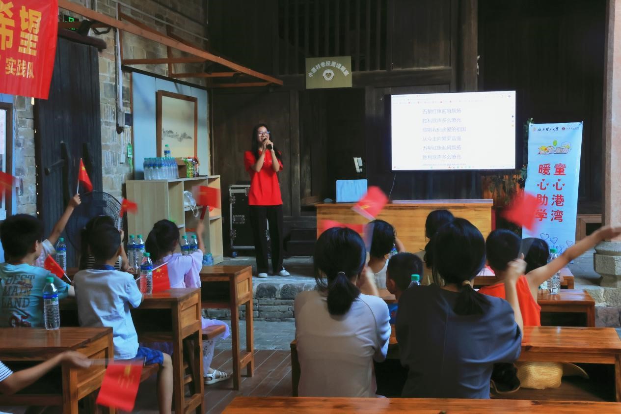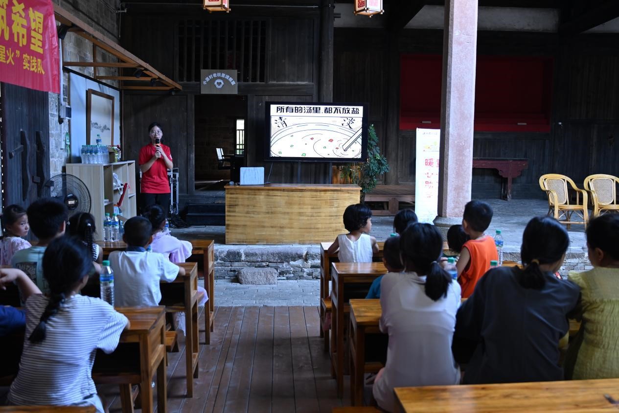 “星火”实践队抵达小源村乡村大学,为孩子们带来《有盐同咸 无盐同淡》红色故事,揭秘宁都人民喝“无盐汤”习俗背后的红色印记,并一起学唱红色歌曲。