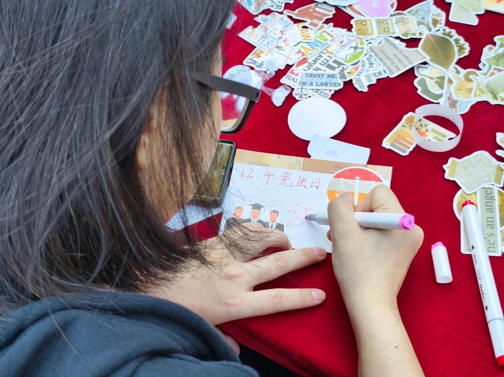在红旗校区文化广场上,法治宣传板吸引了同学们驻足观看,趣味多样的活动吸引了一批又一批的同学参与其中。宪法知识问答、法条有奖背诵、法律知识抢答、答题小游戏……宪法日游园会的活动将枯燥的法律知识生动有趣地呈现出来,提高了普法的参与度,使师生了解了更多的法律知识。“一张张小卡片上印着宪法知识问题,以一问一答的方式,不仅让我印象更加深刻,还能把宪法知识传播得更广。”正在参与知识问答的倪晨雪同学说到。