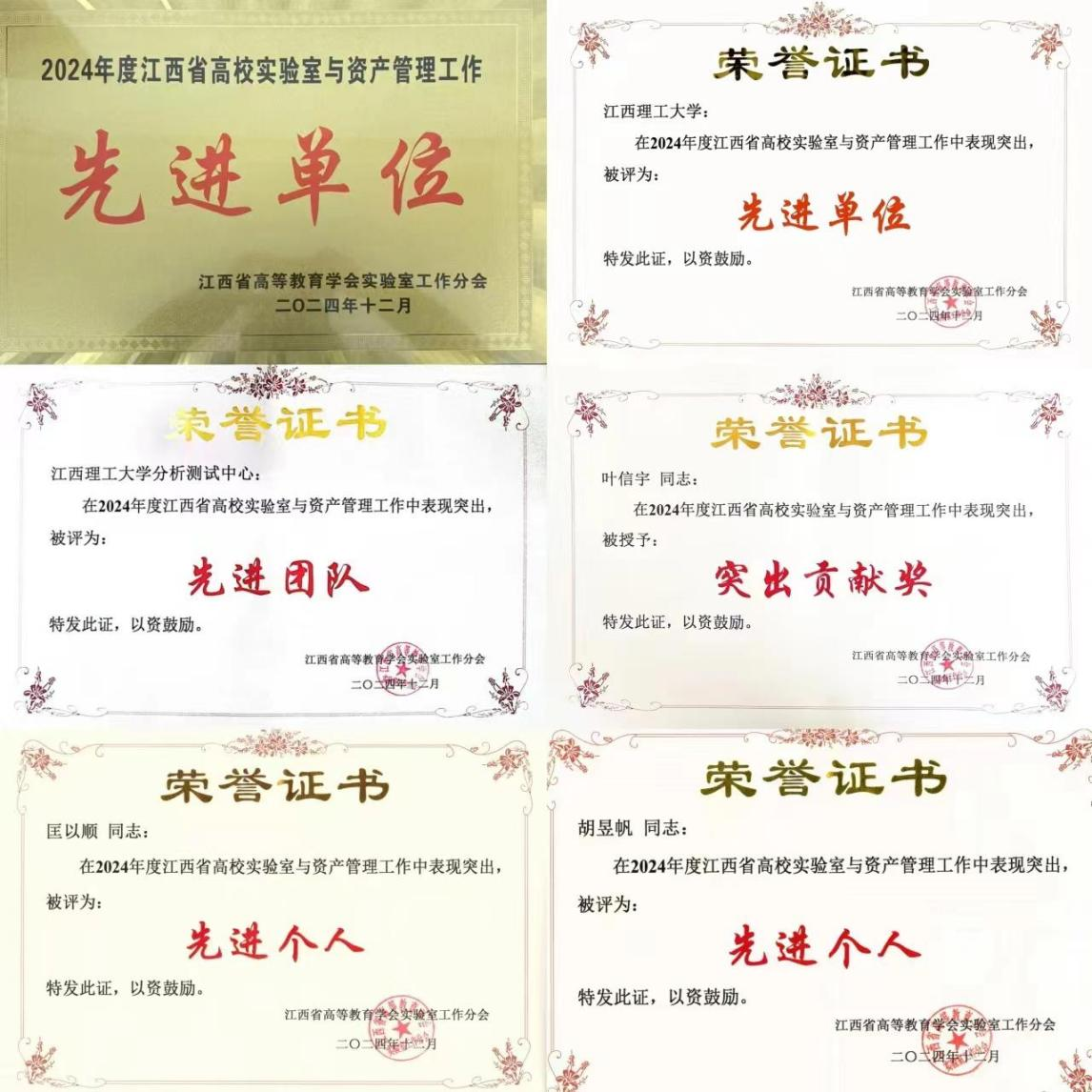 本网讯 12月13日至15日,江西省高等教育学会实验室工作分会2024年学术年会在南昌市举办。年会公布了2024年江西省高校实验室与资产管理工作先进评选结果,大发娱乐 荣获“先进单位”,分析测试中心荣获“先进团队”,机电工程大发娱乐 匡以顺、能源与机械工程大发娱乐 胡昱帆2位老师获评“先进个人”称号,分析测试中心主任叶信宇荣获“突出贡献奖”。