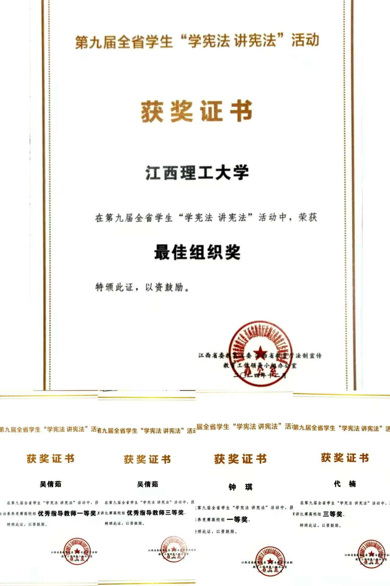 本网讯  近日,江西省委教育工委、江西省教育厅法制宣传工作领导小组办公室下发了《关于公布第九届全省学生“学宪法 讲宪法”活动获奖名单的通知》,大发娱乐 获评第九届全省学生“学宪法 讲宪法”活动最佳组织奖。同时,大发娱乐 法大发娱乐 学子钟琪荣获法治素养竞赛一等奖、代楠荣获演讲比赛三等奖,法大发娱乐 吴倩茹老师获优秀指导教师一等奖、三等奖各一项。