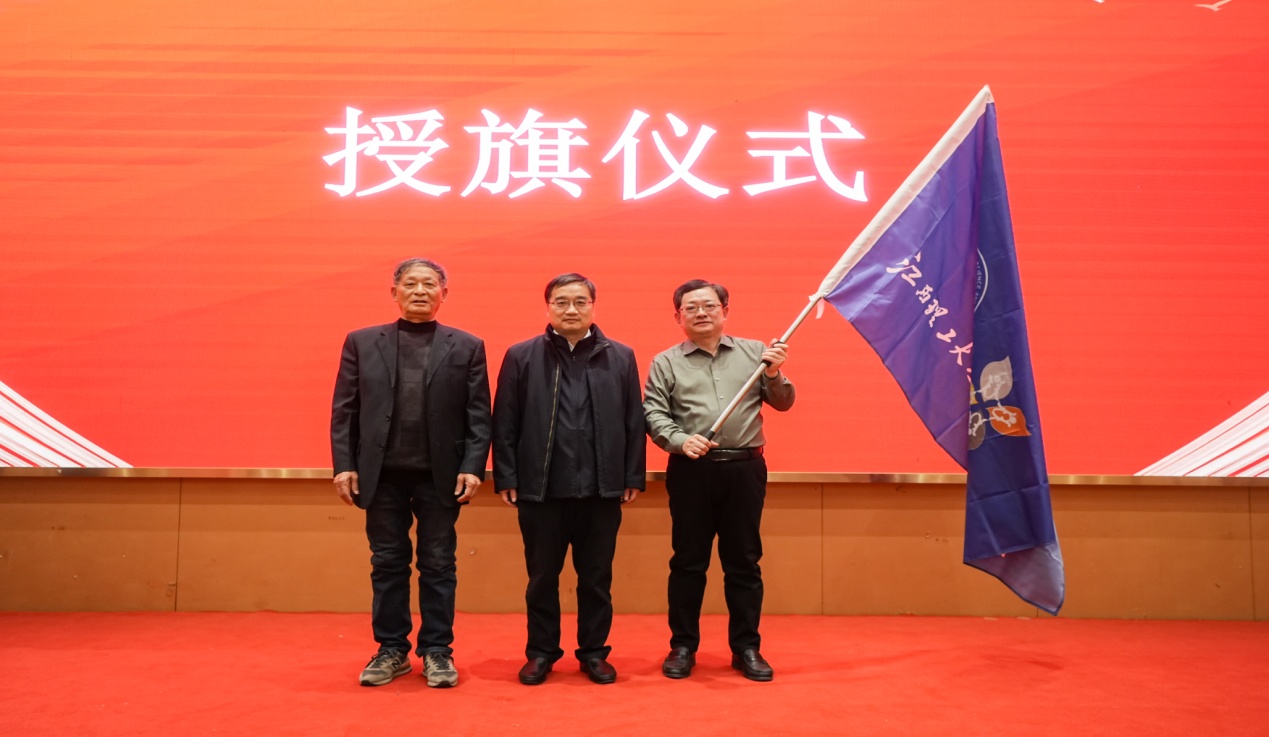 讲话并授旗。他向精心筹备本次会议的各位校友致以诚挚的问候,对第一届理事会始终牢记办会宗旨,在搭建交流平台、凝聚校友力量、助力校友成长、协同联动创新、整合校友资源等工作给予充分肯定,向新当选的第二届理事会人员表示热烈祝贺。