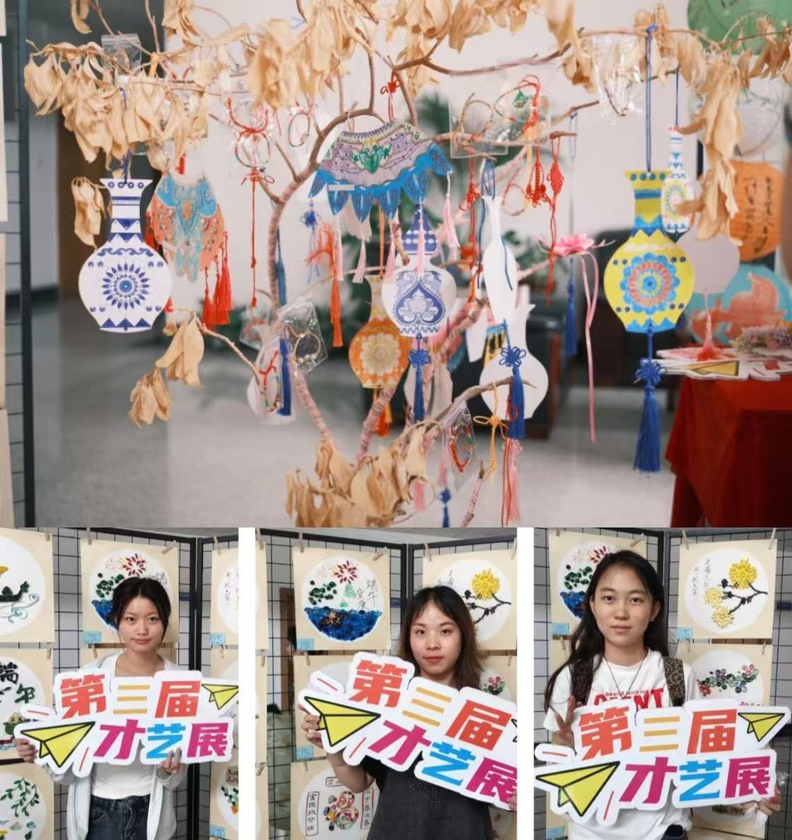 “枯木逢春展新颜,废物巧用显创意”。活动现场,一颗“会开纸花”的枯树成为大家关注的焦点。原来,这棵枯树的枝头上挂满了同学们彩绘而成的花瓶、编织而成的中国红结。当枯树的萧瑟碰上盎然的缤纷,它便摇身一变,不仅变成了“会开花”的枯树,还变成了中华才艺展的“小小网红”,同学们争相在它身边拍照打卡。