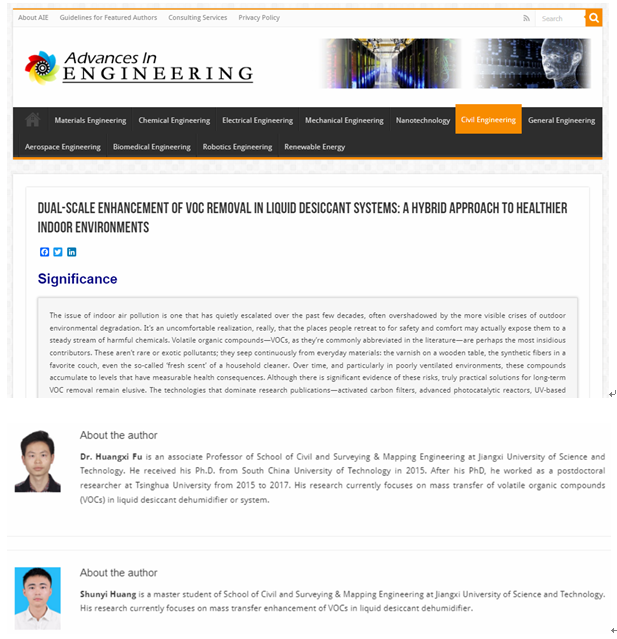 符黄喜副教授课题组发表在Applied Thermal Engineering期刊上的论文“A hybrid technology for enhancing VOC transfer in liquid desiccant dehumidifiers: Combining surfactant and internal cooling”被国际著名科技机构Advances in Engineering(AIE)遴选为关键科学文章,并以“Dual-Scale Enhancement of VOC Removal in Liquid Desiccant Systems: A Hybrid Approach to Healthier Indoor Environments”为题进行了专题报道。土木与测绘工程大发娱乐