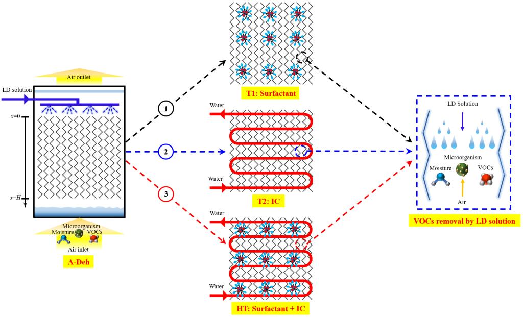室内挥发性有机化合物(VOCs)对居民健康构成严重威胁。液体除湿系统在除湿过程中具有去除VOC的潜力,有望为室内VOC去除开辟新路径。现实情况暴露出去除率偏低的核心问题,而这与VOC在除湿系统中传质驱动力差息息相关。针对这一问题,该课题组提出了一种采用“表面活性剂+内冷”混合驱动的新方法,该方法“利用表面活性剂富集疏水性VOC促进界面传质,同时采用内冷抑制溶液温升促进系统内部传质”。结果表明:该方法的实施能有效改善“VOC传质驱动力在微观溶液界面较差、在宏观系统内部被恶化”的突出问题,使得VOC在除湿器中的传质得到双重强化,最终使得VOC去除性能提升了约63%。
