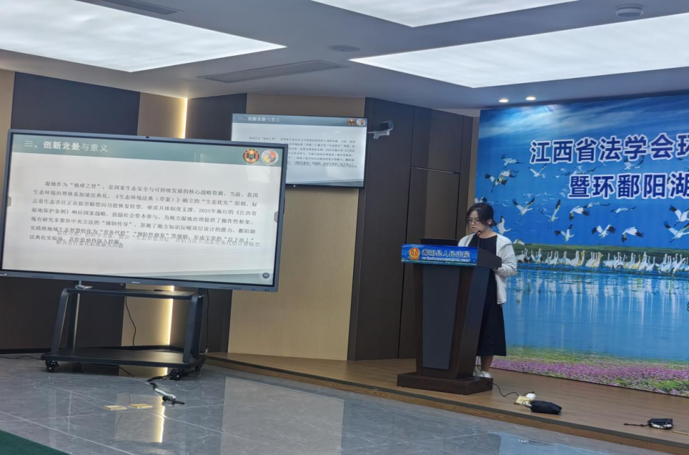 研究生郭娟、王信凯、曾国强、李小敏等同学分别以《湿地修复的鄱阳湖方案;司法赋能生态修复责任机制的法典化探索》《论流域生态环境案件管辖机制的专门化》《协同治理视域下鄱阳湖生态修复责任制度的规范重构》《生态修复的本质检视与路径优化》为题作汇报。孟春阳作为交流环节与谈人,对发言人的研究成果逐一点评,其点评兼具专业性与针对性,获得与会专家学者的高度认可。