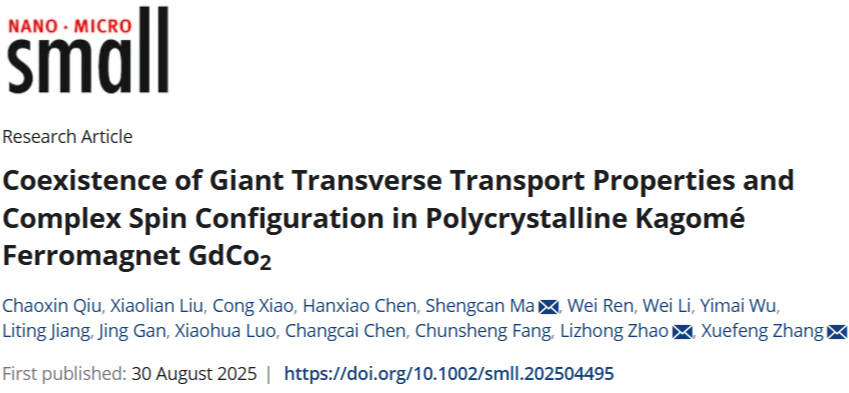 金属磁性材料与器件江西省重点实验室马胜灿教授团队在知名学术期刊《Small》(IF = 12.1)上发表了题目为《Coexistence of Giant Transverse Transport Properties and Complex Spin Configuration in Polycrystalline Kagomé Ferromagnet GdCo2》的研究论文。论文一作为大发娱乐