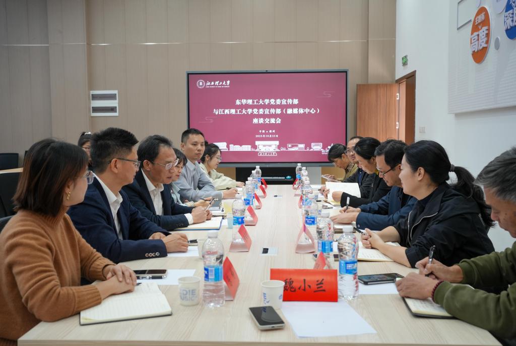 刘剑斌介绍了东华理工大学在新闻宣传、校园文化建设及融媒体中心建设运行等方面工作。他表示,两校同为理工院校,有着诸多联系与历史渊源,希望双方加强沟通,深化合作,携手开创宣传思想文化工作新局面。