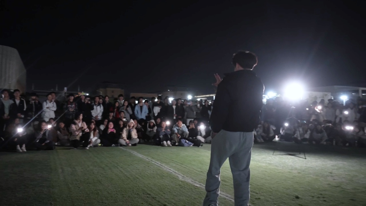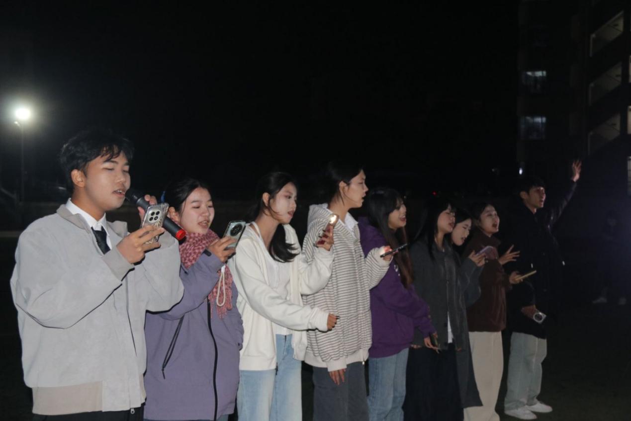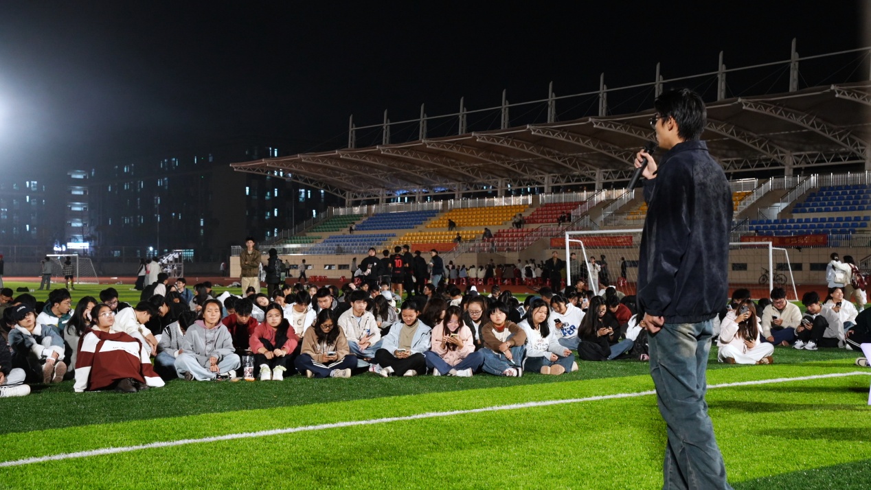 在三江校区东园分会场,舞台以开阔草坪为背景,夜色中灯光与星光辉映。从深情独唱到激昂的乐队合奏,从经典流行到动感舞曲,声乐、器乐、舞蹈等多种形式轮番登场。街舞社带来的热力表演瞬间点燃全场,同学们纷纷举起手机闪光灯随节奏摇摆,点点光芒汇聚成一片流动的星河。