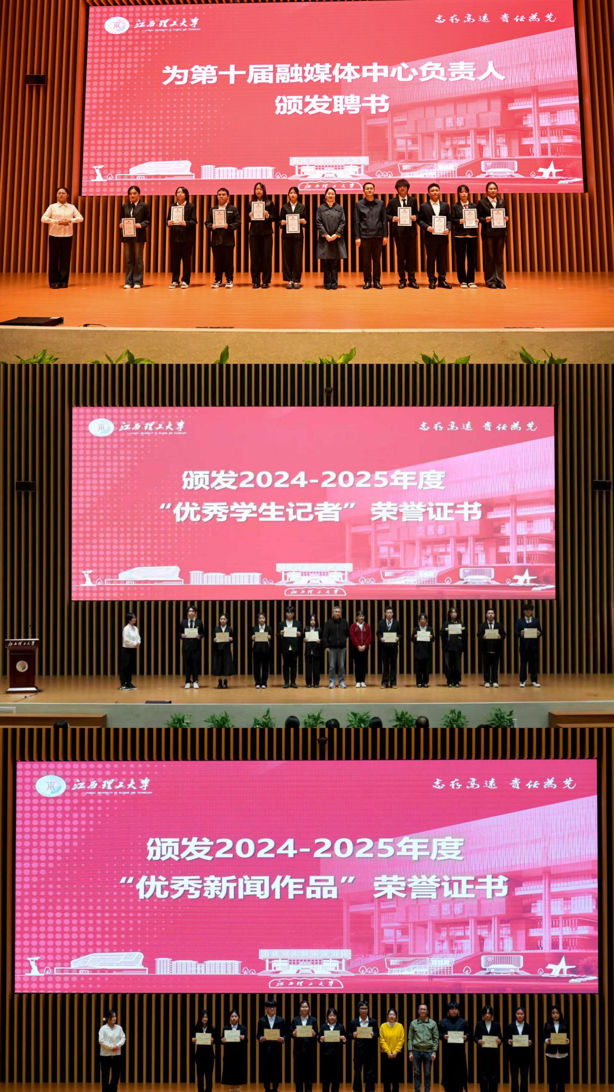 大会对第十届成员的辛勤付出予以表彰。盛晓明、余夏静为第十届主席团成员颁发聘书,指导老师为年度“优秀学生记者”“优秀新闻作品”获奖者颁奖。会上还公布了2025年迎新宣传、运动会宣传工作先进个人名单。