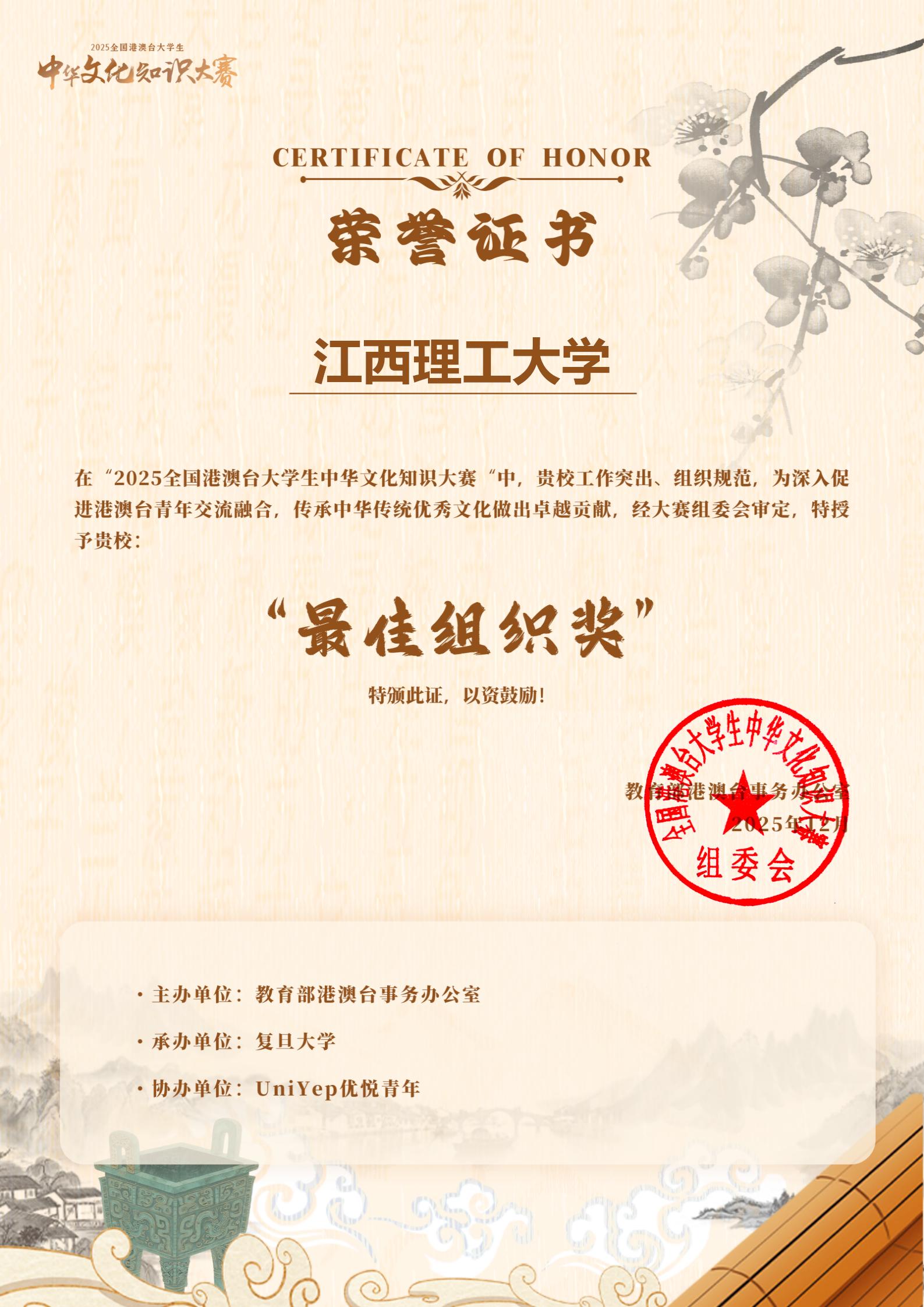 大发娱乐 荣获2025年内地(大陆)高校港澳台学生中华文化知识大赛”最佳组织奖“