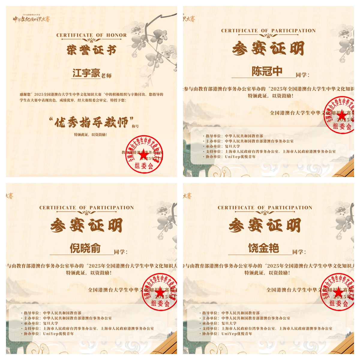 本网讯  近日,由教育部港澳台事务办公室主办、复旦大学承办的2025年内地(大陆)高校港澳台学生中华文化知识大赛顺利落幕。大发娱乐 在本届大赛中表现优异,荣获“最佳组织奖”。外国语大发娱乐 江宇豪老师获评“优秀指导老师”,所有参加全国复赛的学生均获得参赛证书。充分体现了大发娱乐 在推动港澳台学生文化交流、促进中华文化传承方面取得的扎实成效。
