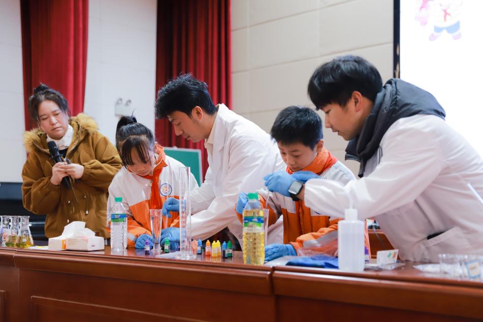 青年博士教师与学生志愿者带领孩子们亲手操作:溶液在瓶中悄然变绿、转红、化黄,如同一盏自动切换的微型信号灯;色素滴入油中,缓缓下沉成一场静谧的“彩虹雨”;荧光在试管中温柔亮起,如同黑暗中点亮的科学之光;泡腾片投入水中,瞬间上演“杯中火山”的喷发奇观……孩子们聚精会神地看着一个个有趣的化学现场,眼神亮晶晶的,笑声、惊叹声、提问声此起彼伏。师生志愿者俯身引导、耐心讲解,在互动中传递知识,在动手中激发兴趣。