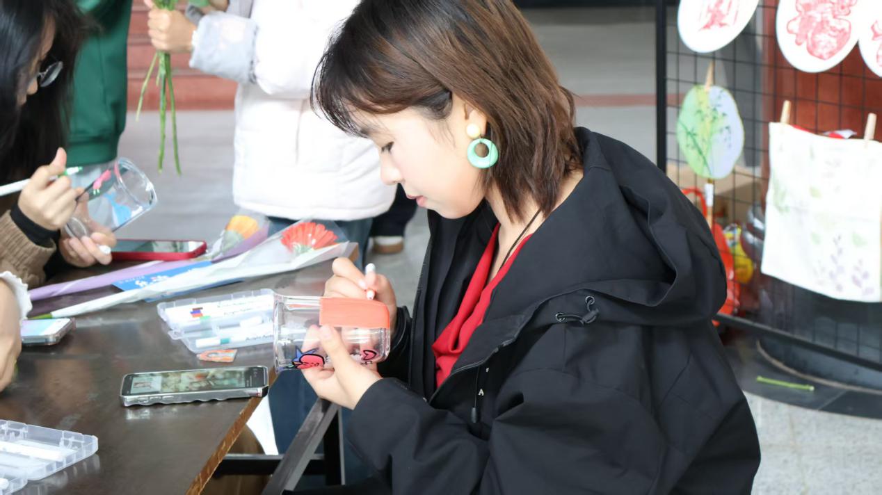 玻璃杯手绘区里创意涌动,女同学们秒变“专属设计师”,以彩笔为媒,在透明杯身勾勒心中憧憬。春日翩飞的蝶影、鲜嫩的繁花碧草,“天天开心”“万事顺意”的暖心寄语,憨态可掬的卡通萌物、简约个性的几何色块,皆成为笔下灵感。原本素净的玻璃杯,在一笔一画间被赋予专属温度,化作承载生活热爱与美好期许的限定信物,让日常饮水也能邂逅诗意与浪漫。