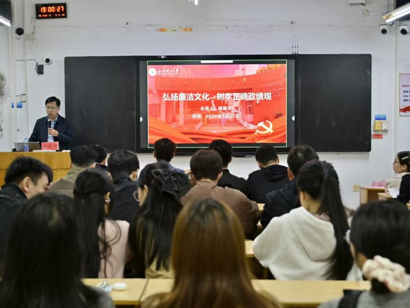 党委书记胡建华面向全体学生党员主讲“弘扬廉洁文化 树牢正确政绩观”专题党课,全体学生党员参加,党课从深刻理解廉洁与政绩观的核心内涵、深刻领会树立和践行正确政绩观的时代意义、从正反案例看政绩观的分水岭、树立和践行正确政绩观的实践路径四个方面展开,引导学生党员筑牢思想根基、强化实干担当、坚守廉洁底线。